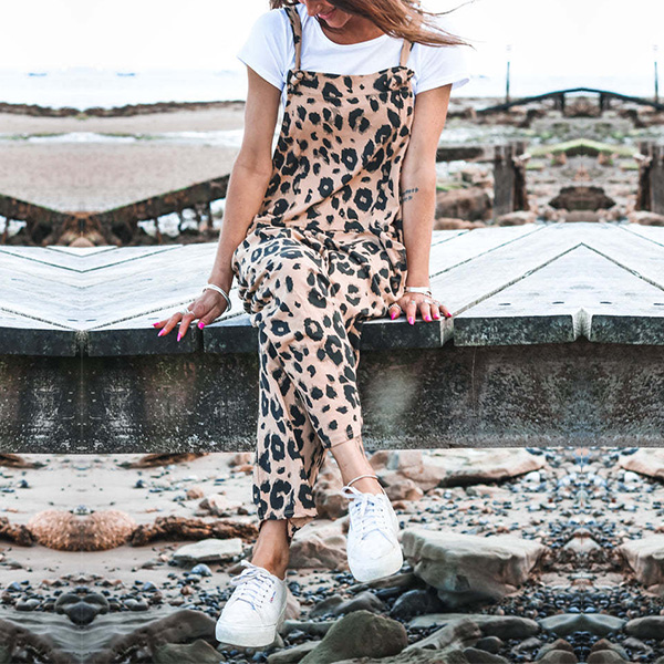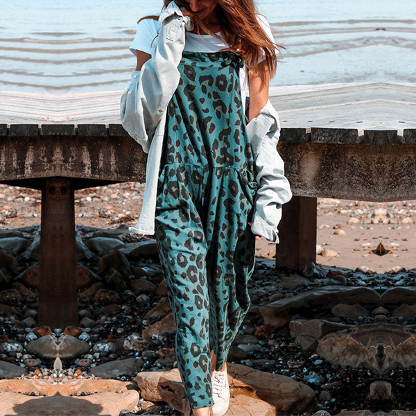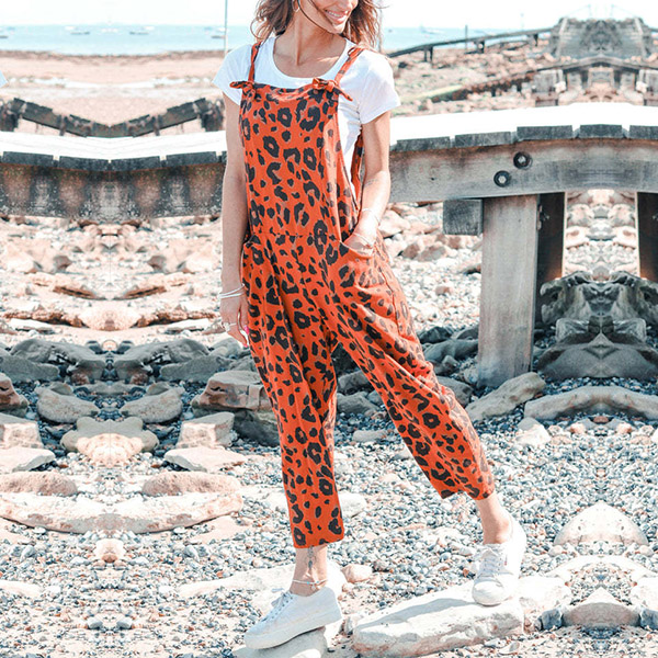 Casual Leopard Printed Patch Pockets Loose Jumpsuit