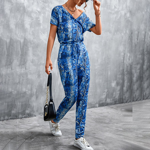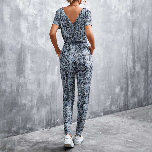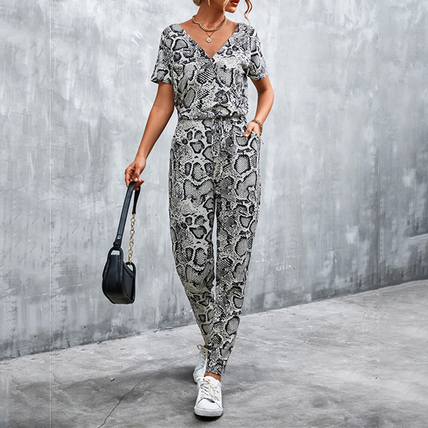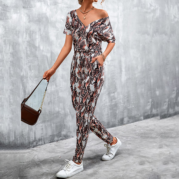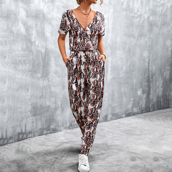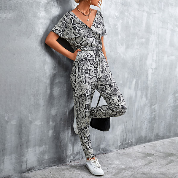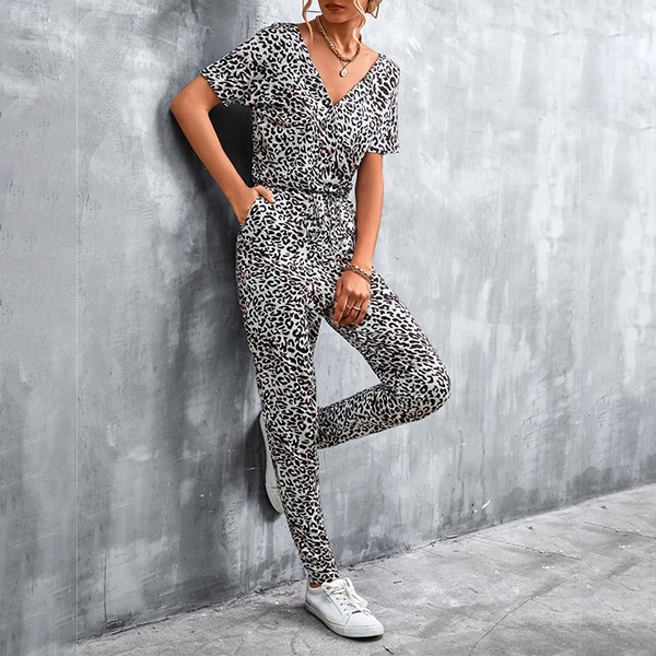 Casual Leopard Printed V-neck Short Sleeve Jumpsuit