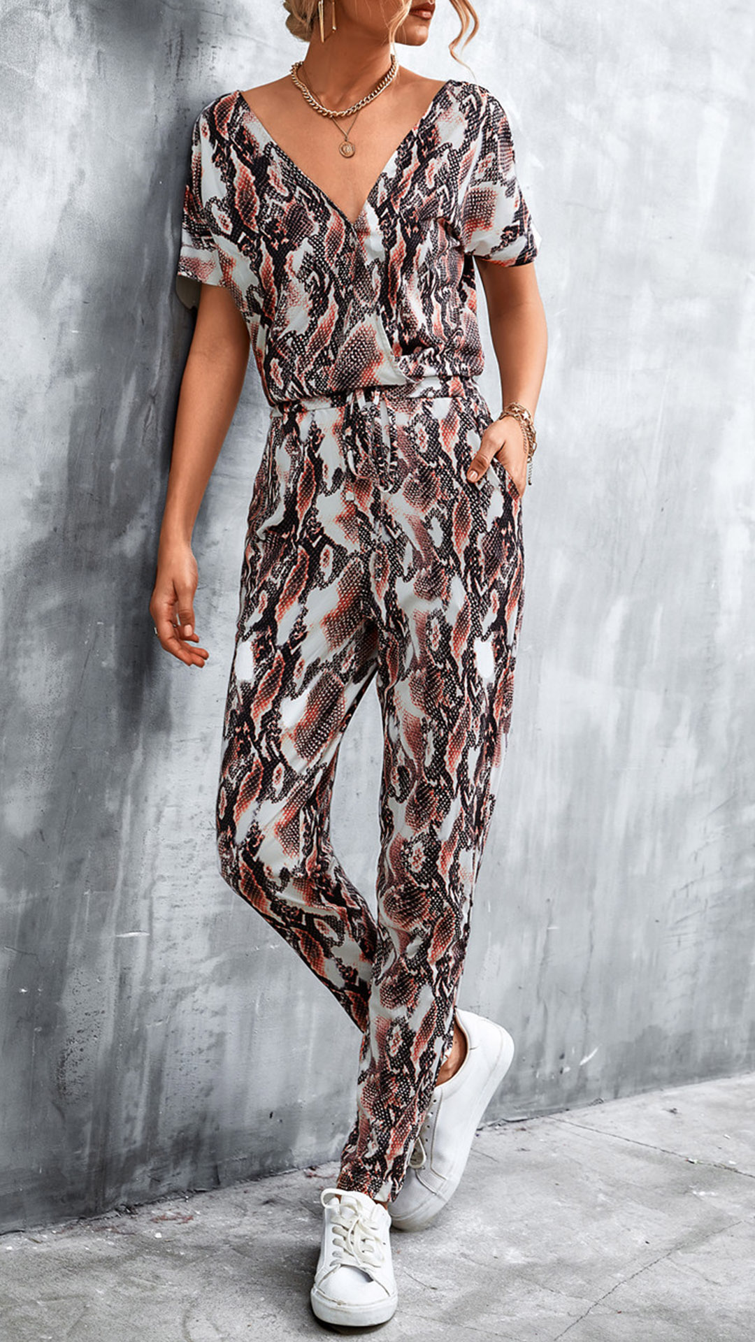 This jumpsuit is made of a lightweight and breathable material, perfect for a day out in the sun. It features a leopard print design, V-neckline, and short sleeves.