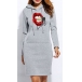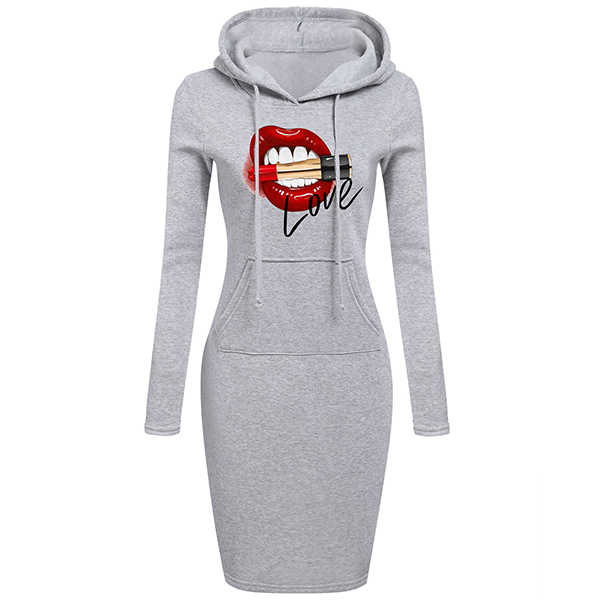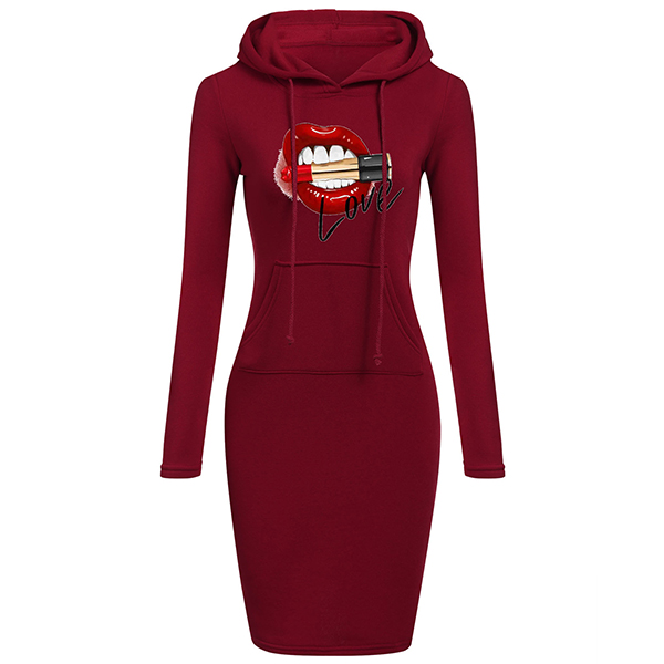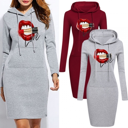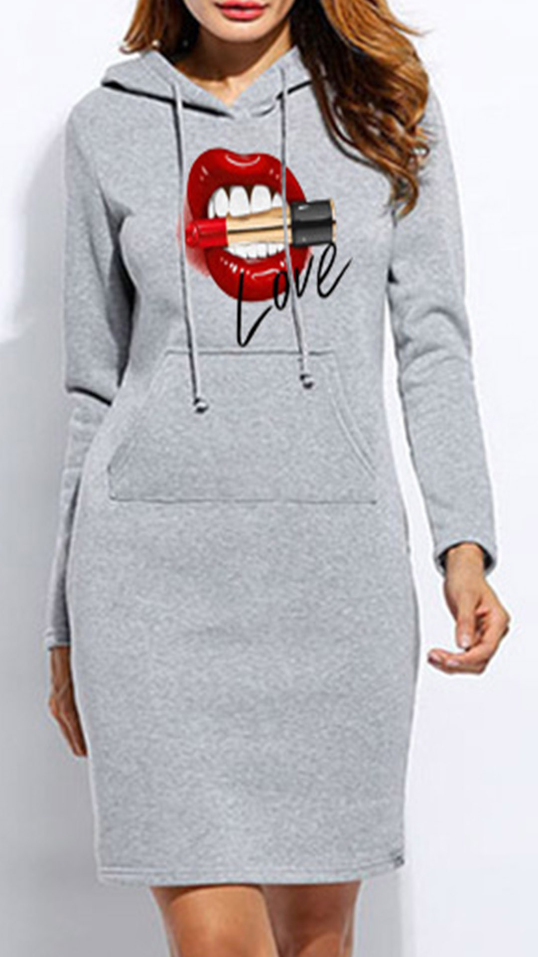 Casual Lip Printed Drawstring Hooded Sweatshirt Dress