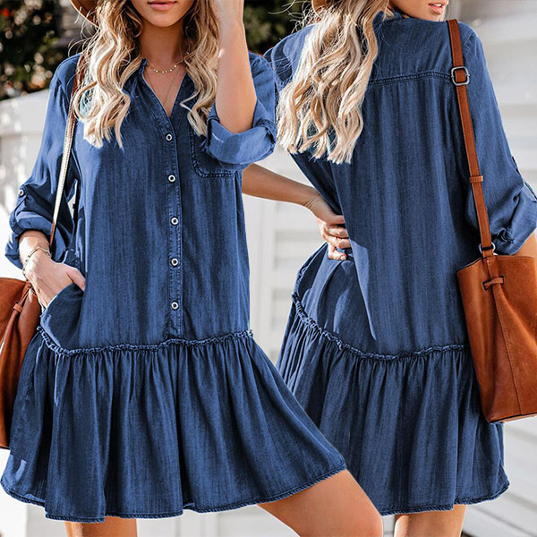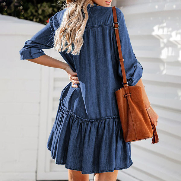 Casual Long Sleeve Buttoned Tiered Denim Dress
