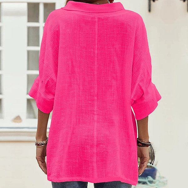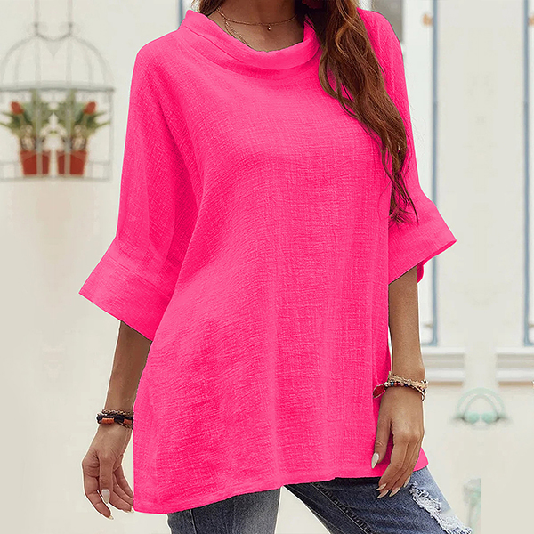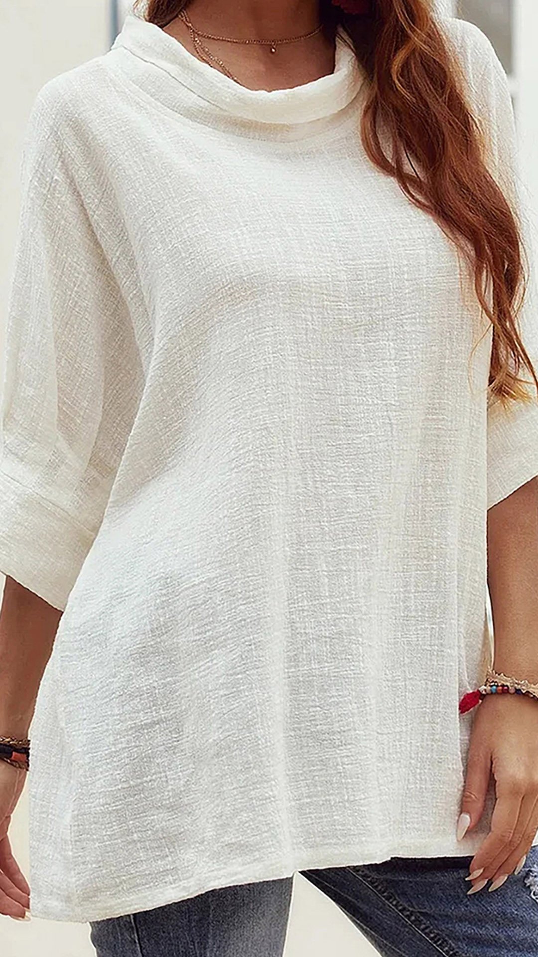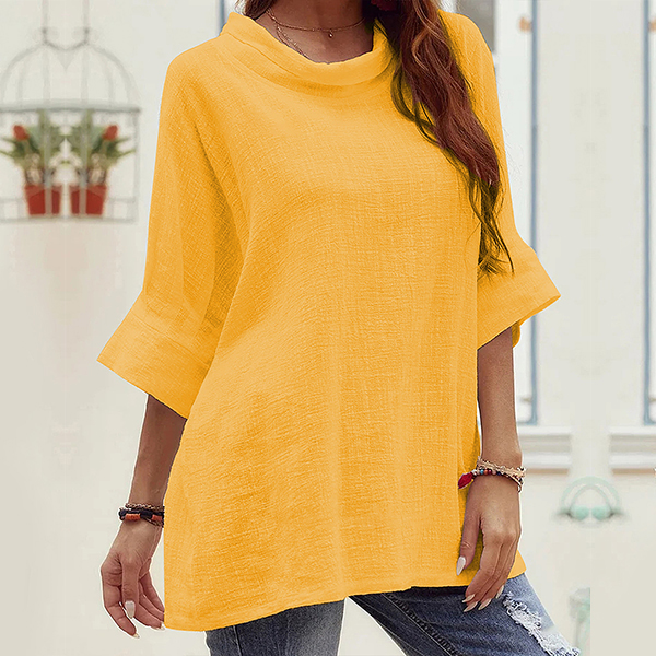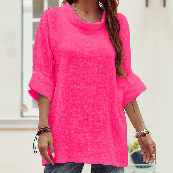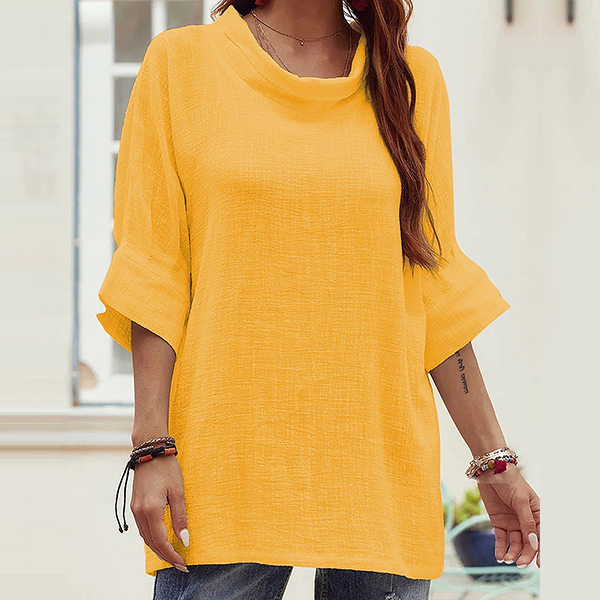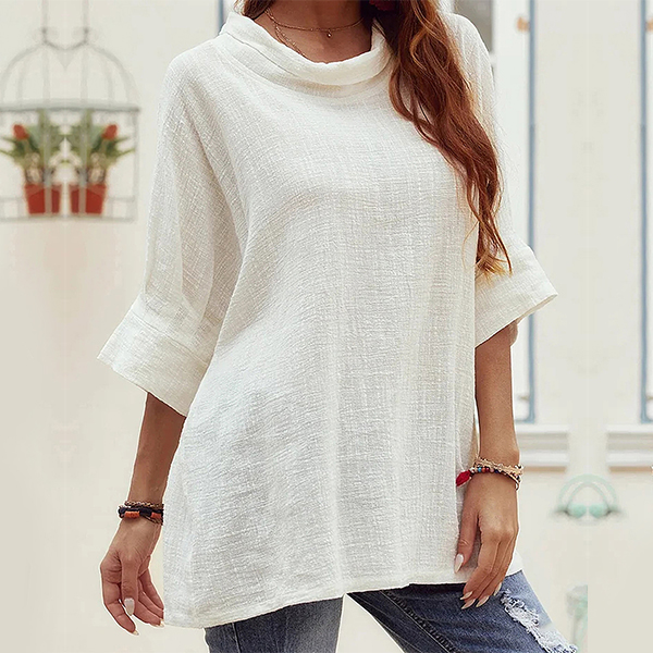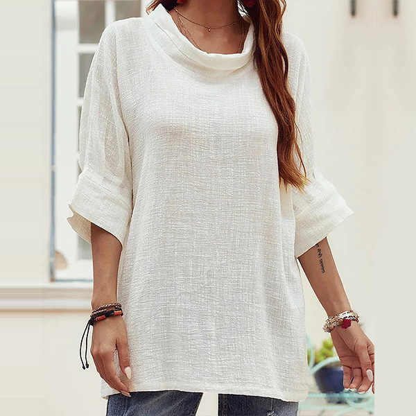 Crafted from a soft, breathable fabric, this relaxed-fit top features a mock neckline and elbow-length sleeves for a modern, minimalist look. Elevate your casual wardrobe with this effortlessly chic mock neck blouse.