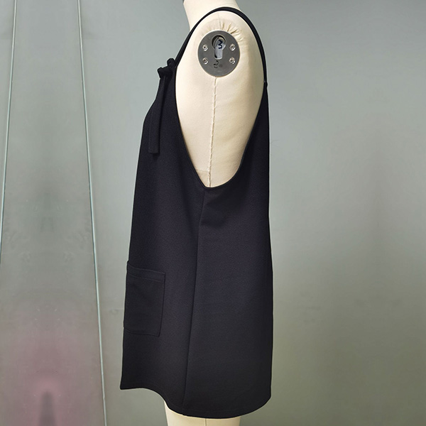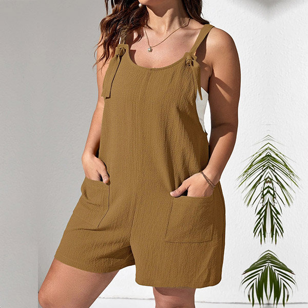 This romper featuers a loose fit, patch pockets, and self-tie shoulder straps for a trendy and casual look.