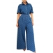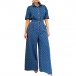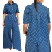Casual Plaid Old-washed Denim Two-piece Set Consist of Short Sleeve Shirt and Wide-leg Pants