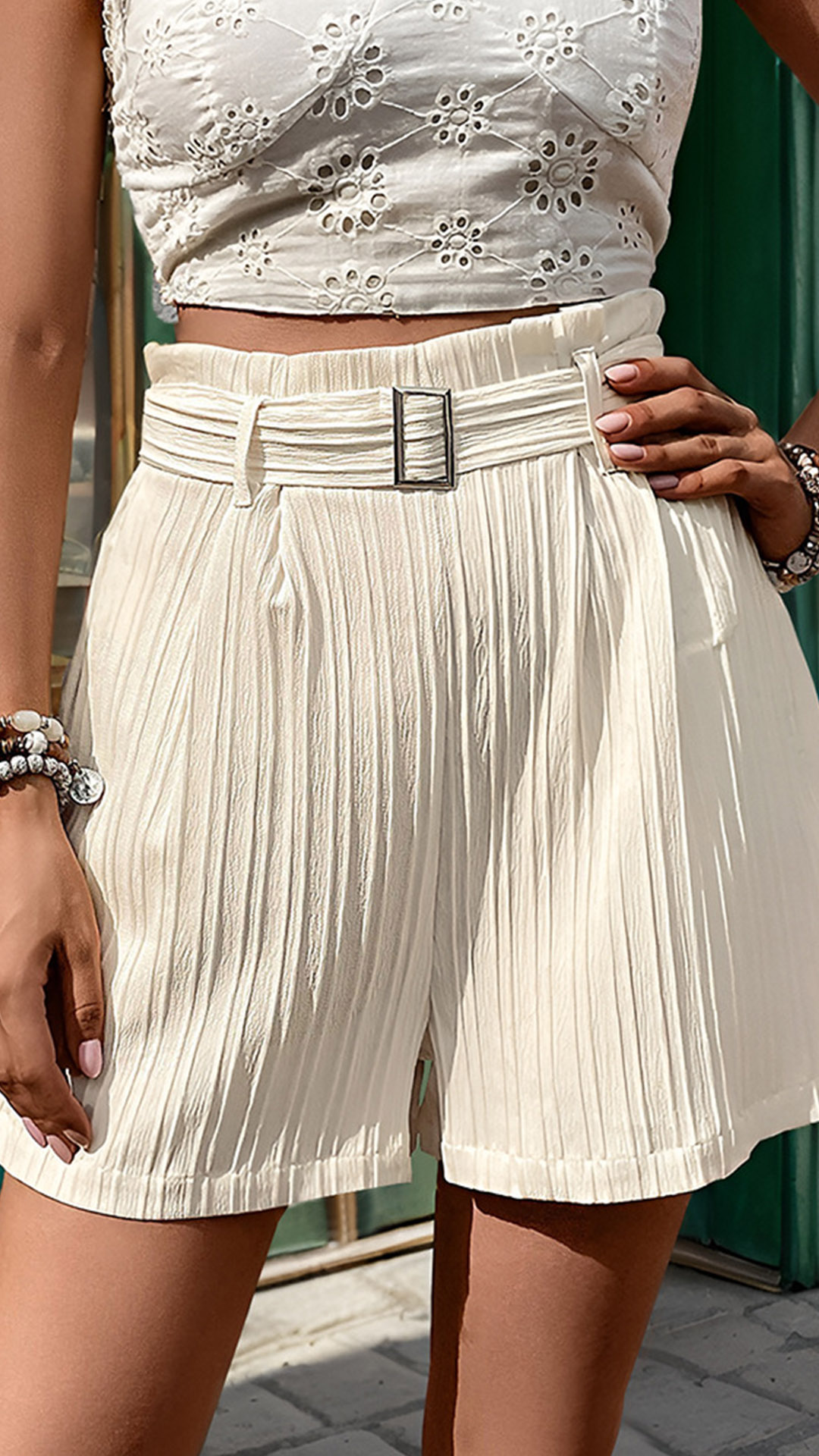 These shorts features pleated design, high-rise waistline, and included belt. The pleated detailing helps to create a streamlined, polished look while still maintaining a relaxed, casual vibe. Wanna have a try?