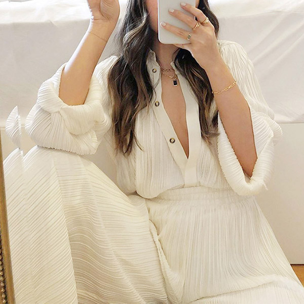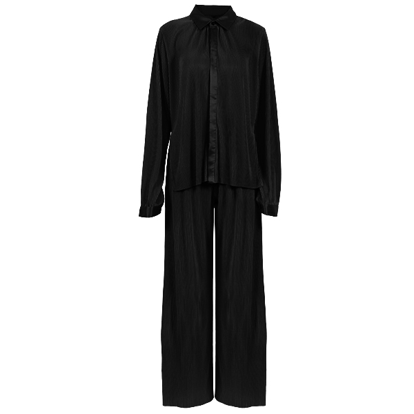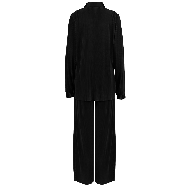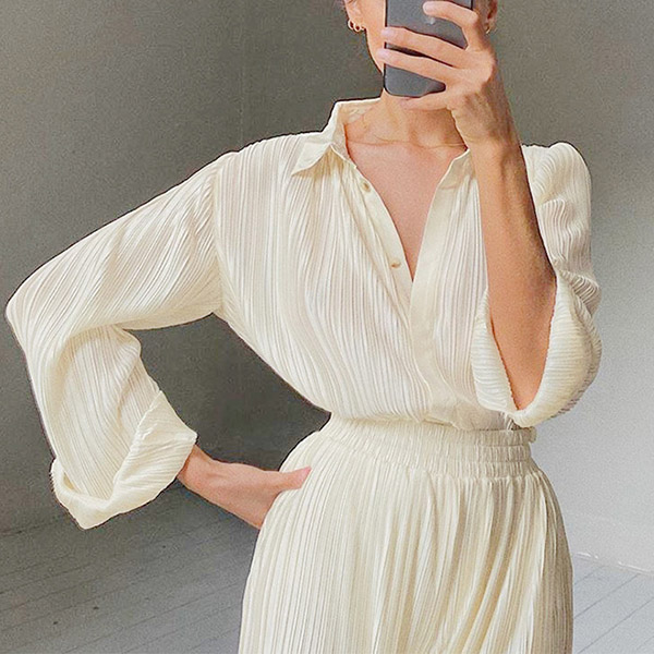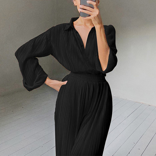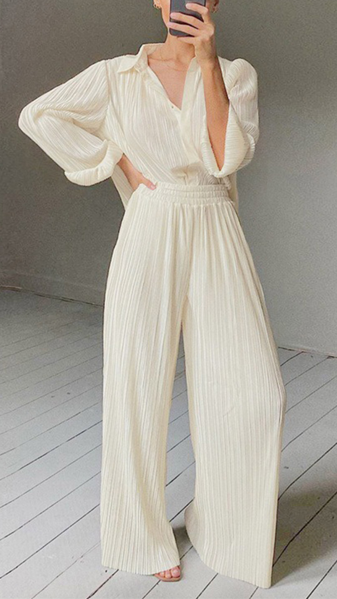 This two-piece set is perfect for a casual day out! The blouse is a pleated style with a button front, and the pants are wide-leg with an elastic waistband. The set is made of a lightweight fabric that is comfortable to wear all day long.