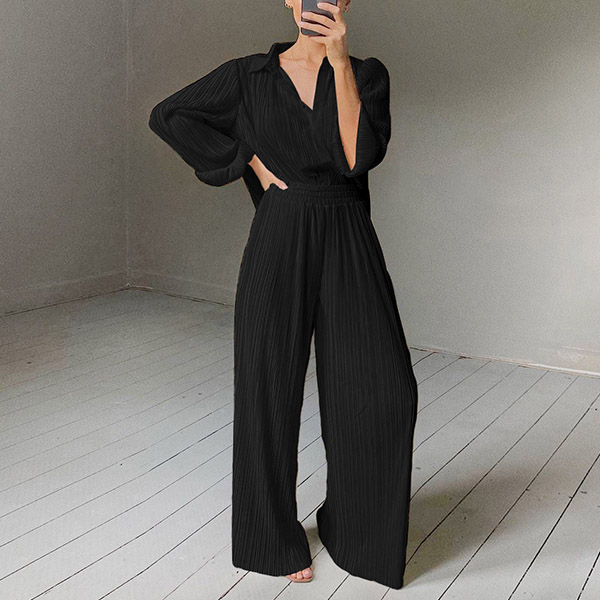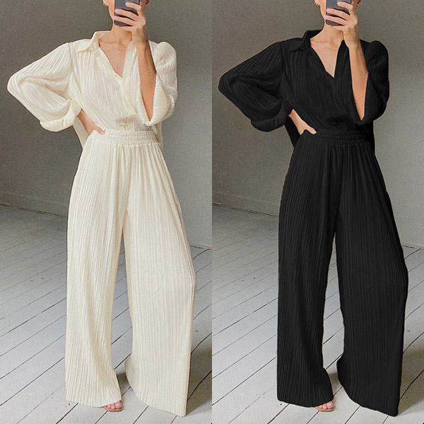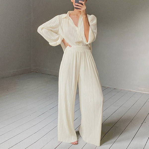 Casual Pleated Two-piece Set Consot of Blouse and Wide-leg Pants