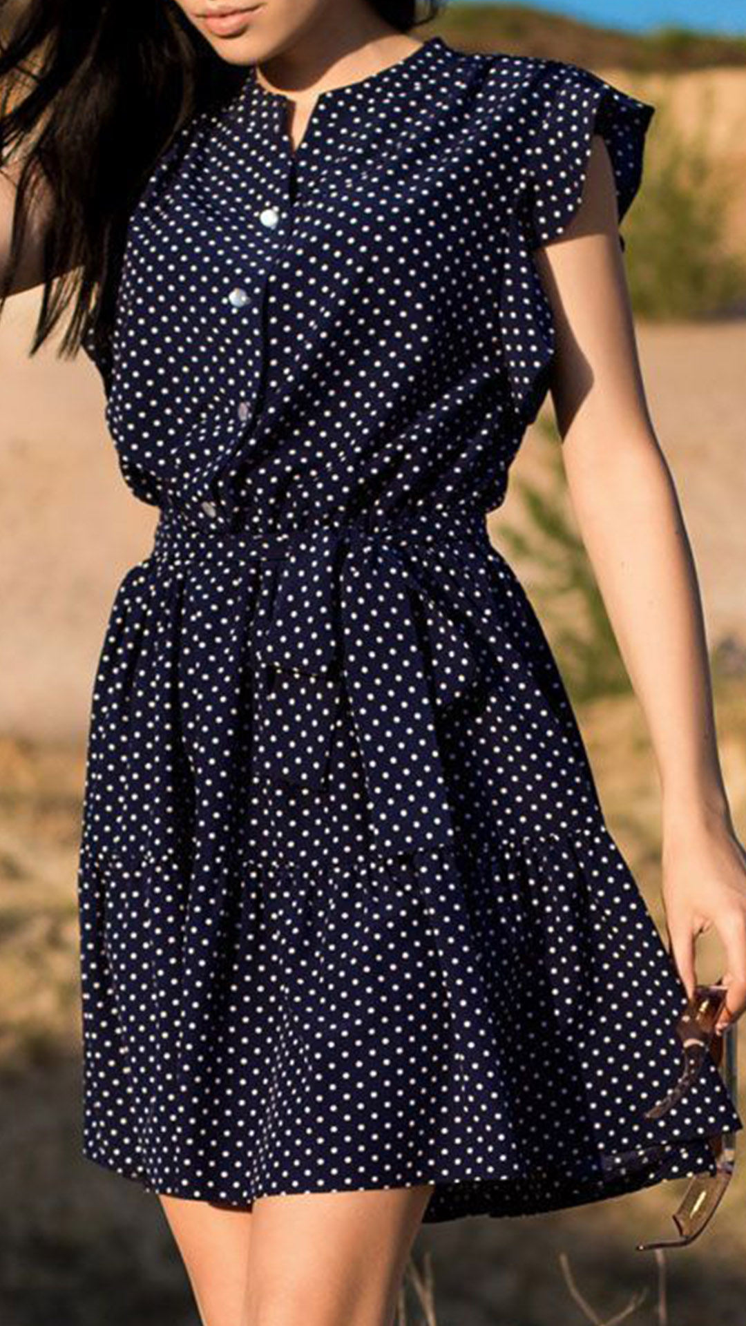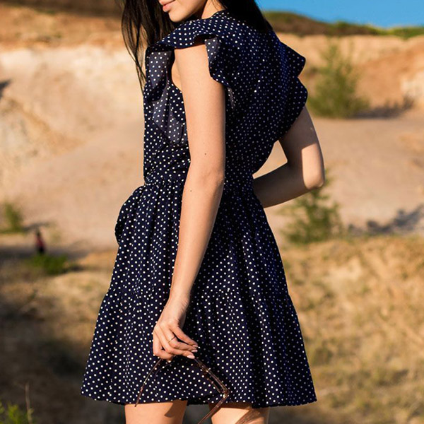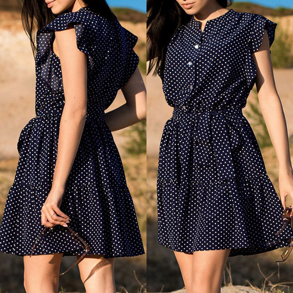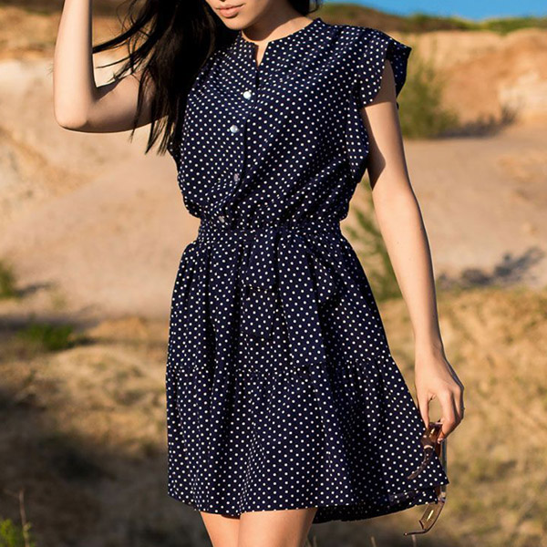 This pretty polka dot dress is perfect for a casual day out! It features front buttoned, cap sleeves with ruffled details, a self-tie waist belt, tiered skirt, casual and chic. It's perfect for a day of shopping or lunch with friends.