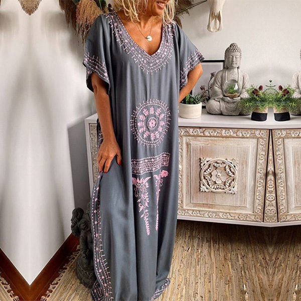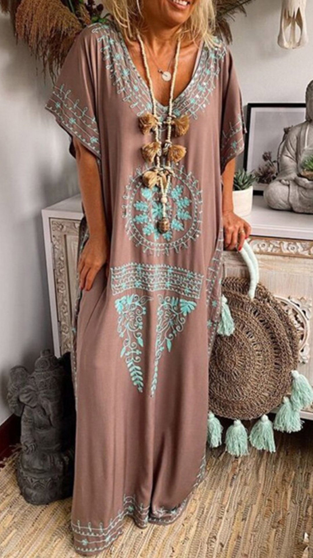 Casual Printed V-neck Short Sleeve Slit Maxi Dress