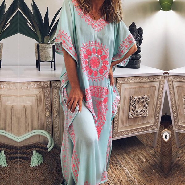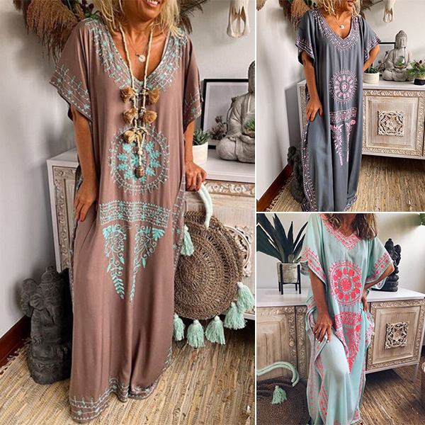 This dress features a flattering V-neckline, short sleeves, and a beautiful print that's perfect for any occasion.