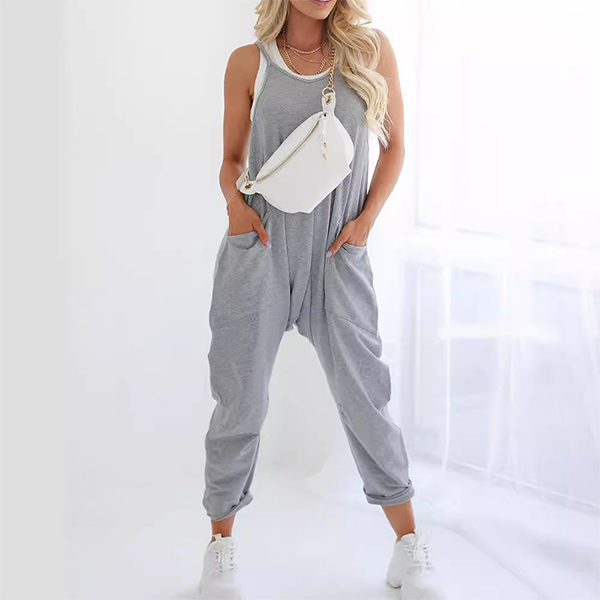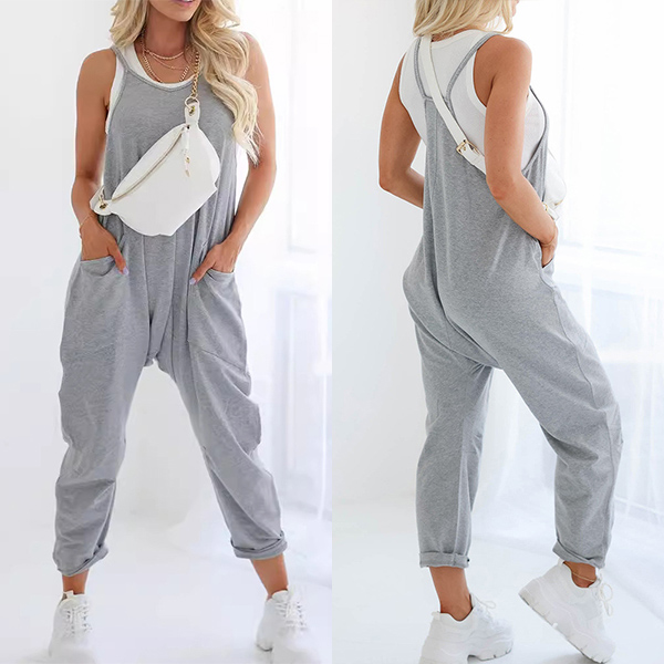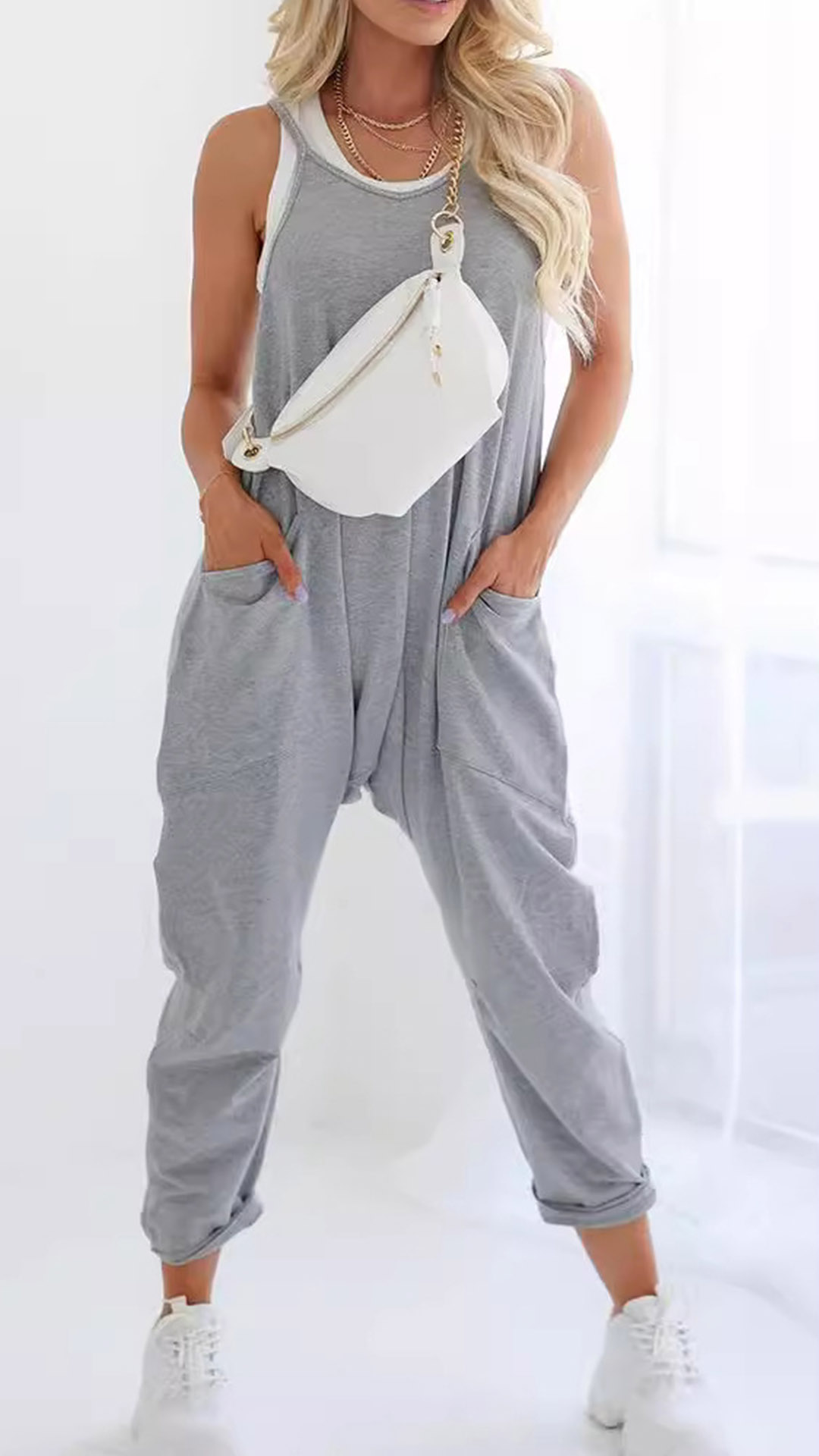 This gray jumpsuit features a comfortable and relaxed fit, a round neckline, patch pockets, It is a go-to piece for effortless and chic everyday wear.
