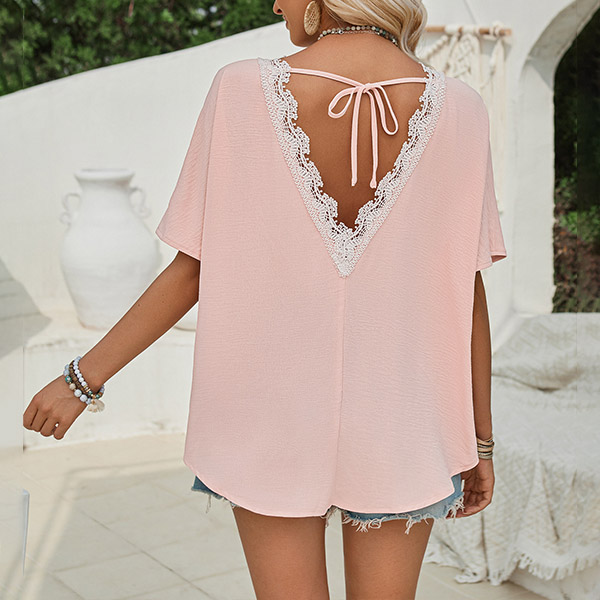 This is trendy and feminine shirt that combines a round neck, short sleeves, backless design with lace spliced for a casual and stylish look. Is it your style?