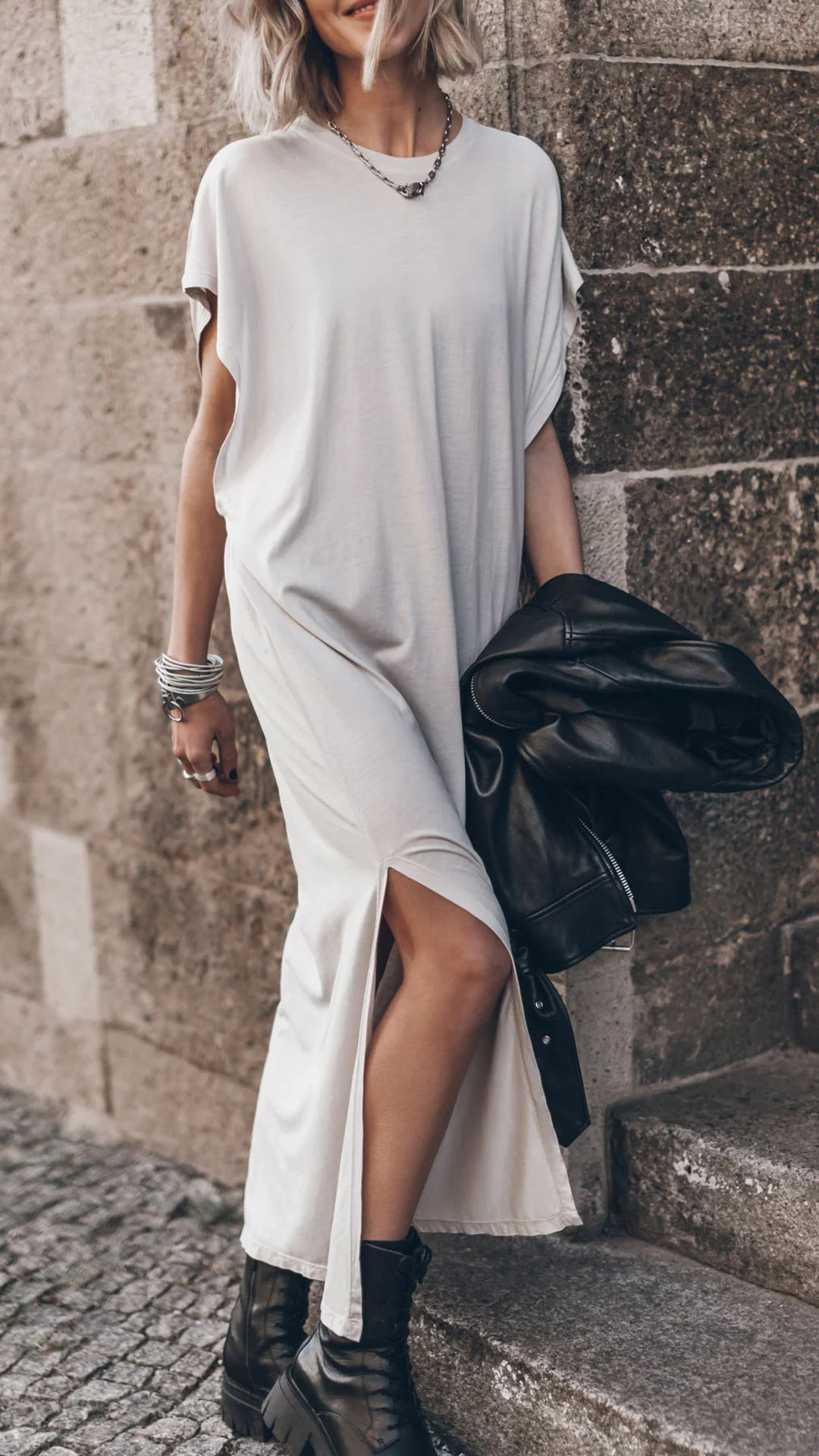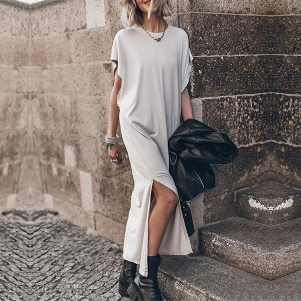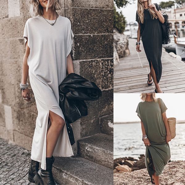 This casual dress features a round neck design with short sleeves and a stylish slit for a relaxed and effortless look.