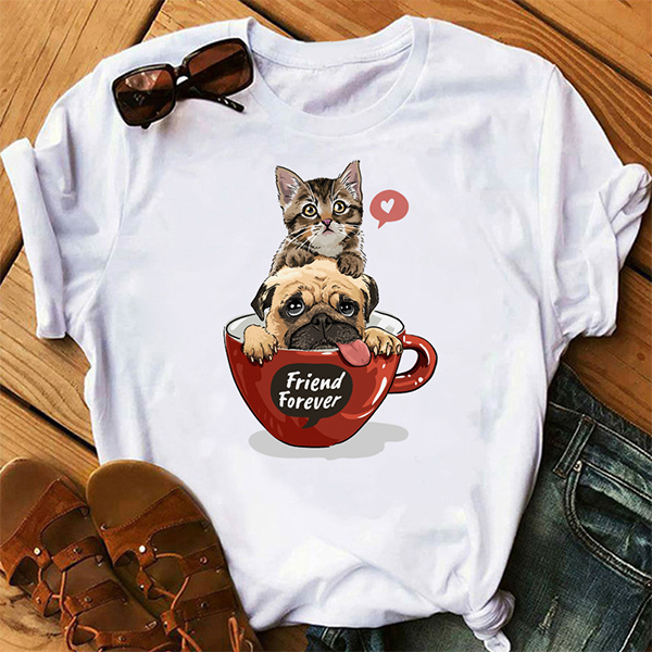 Casual Round Neck Short-Sleeved T-Shirt: Cartoon Animal Cat and Dog Print