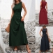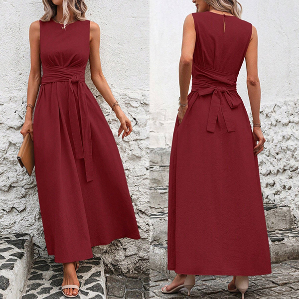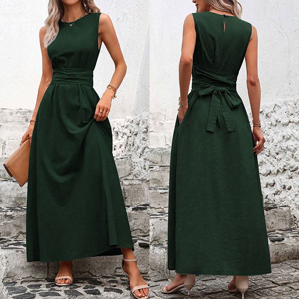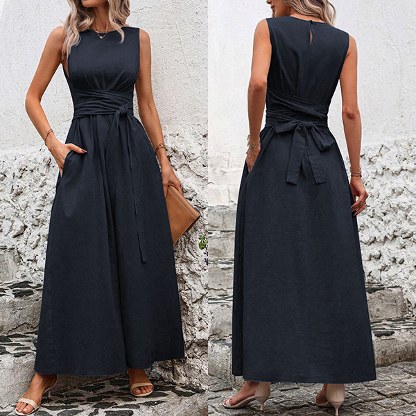 Casual Round Neck Sleeveless Dress with Waist Knot Pockets and Tie-Back Design