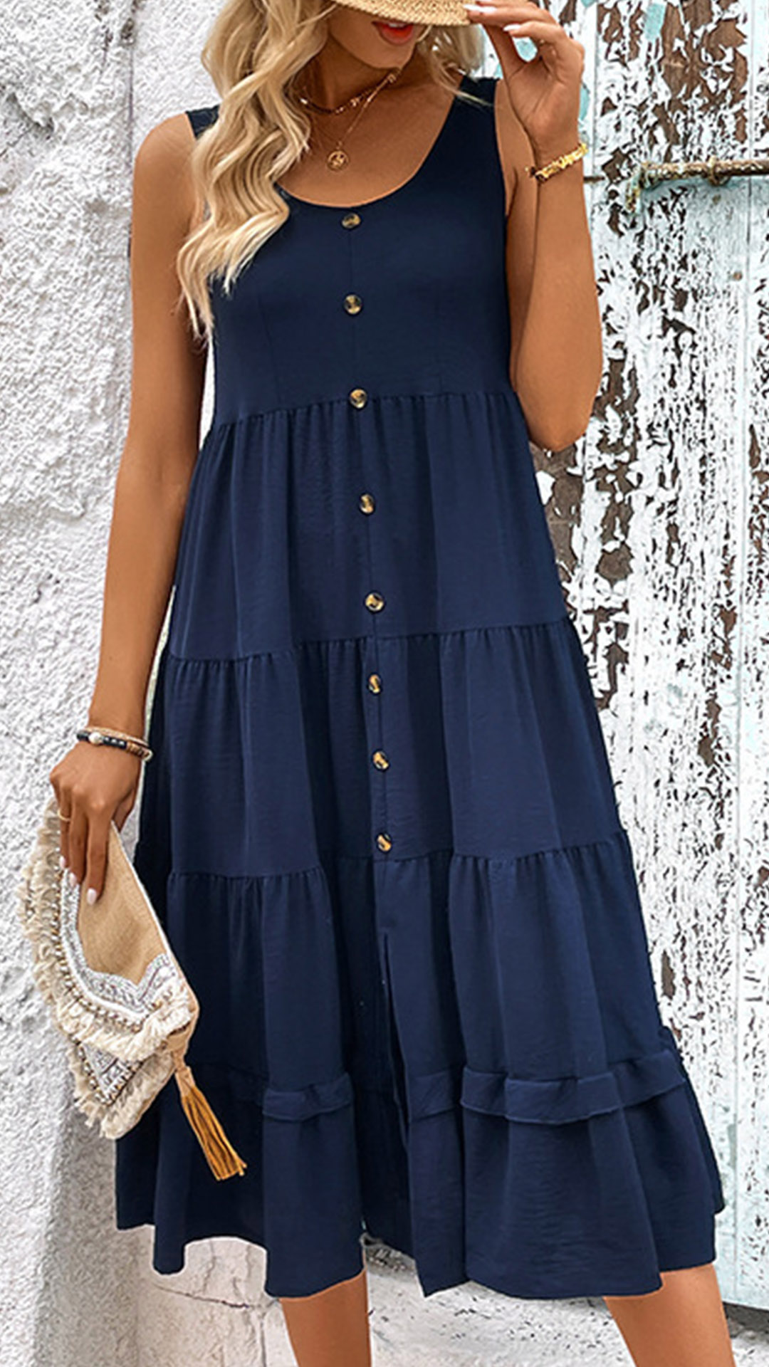 This charming and effortless dress features a tiered design that adds a playful and feminine touch to the overall aesthetic. The round neckline provides a comfortable and flattering silhouette, while the sleeveless construction offers a breezy and versatile wear. Wanna have a try?