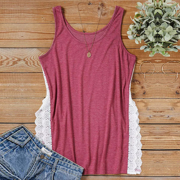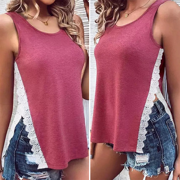 This versatile and stylish top features a comfortable round neckline, sleeveless design, trendy side slit with delicate lace splicing. Pair it with shorts for a chic and effortlessly cool look.