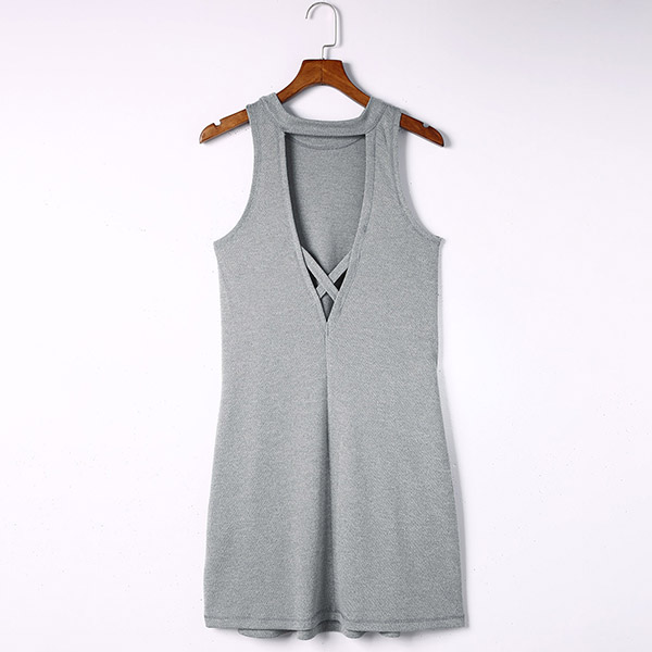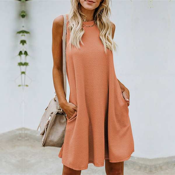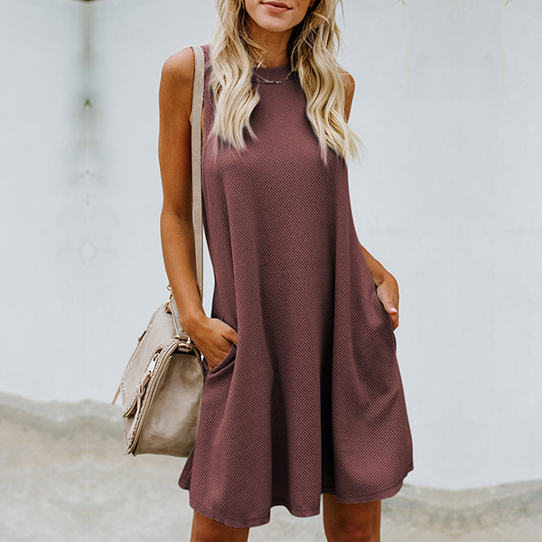 Casual Round Neck Sleeveless Side Pockets Backless Mini Dress