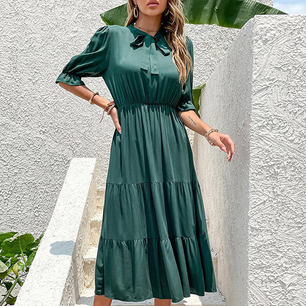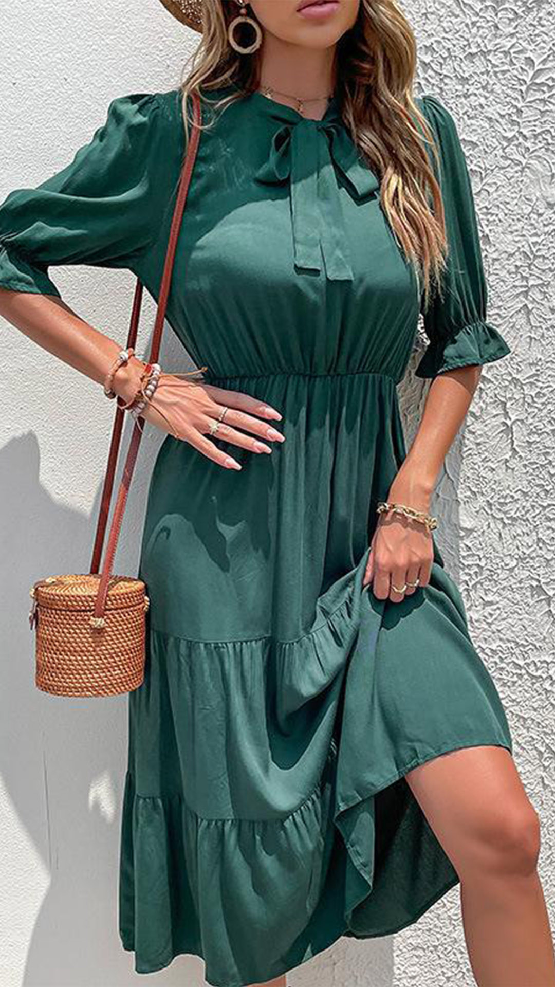 Looking for a fun and flirty dress that you can wear on any casual occasion? Look no further than this green Midi Dress! This pretty dress features ruffle short sleeves, a round neckline with self-tie design, and a tiered skirt that falls just below the knee. Wanna have a try?