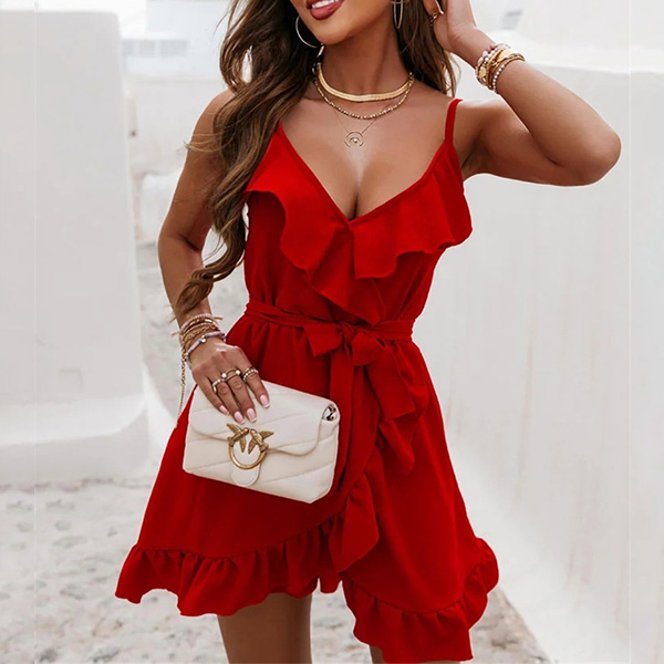 This mini dress features a front ruffle design, V-neckline, thin shoulder strap, irregular hemline, and self-tie waist details for a trendy and effortless look.