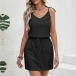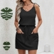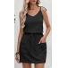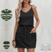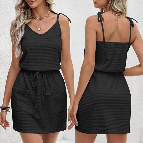 Casual Self-tie Shoulder Strap Drawstring Waist Patch Pockets Mini Dress