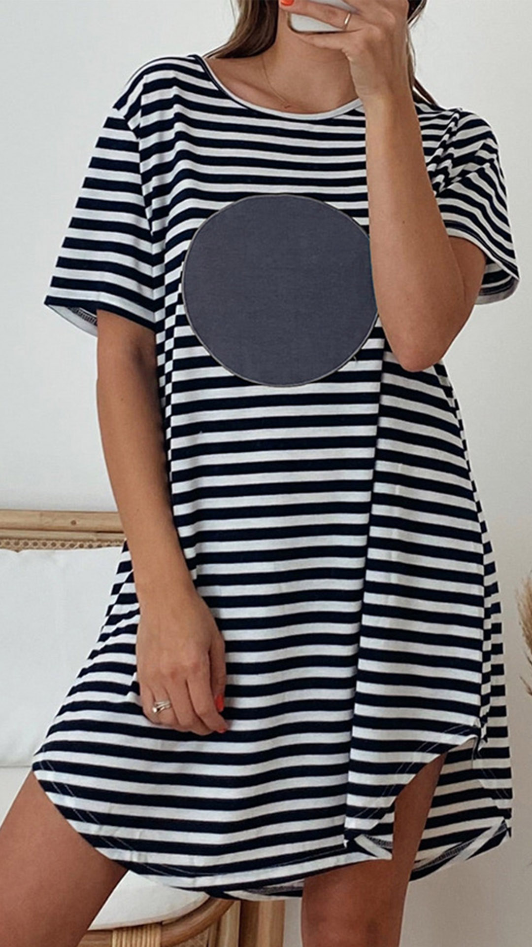 This fun and flirty dress is perfect for a casual day out! The short sleeves and round neck keep it casual, while the stripe and heart pattern and loose fit make it flirty and fun.