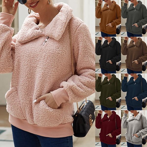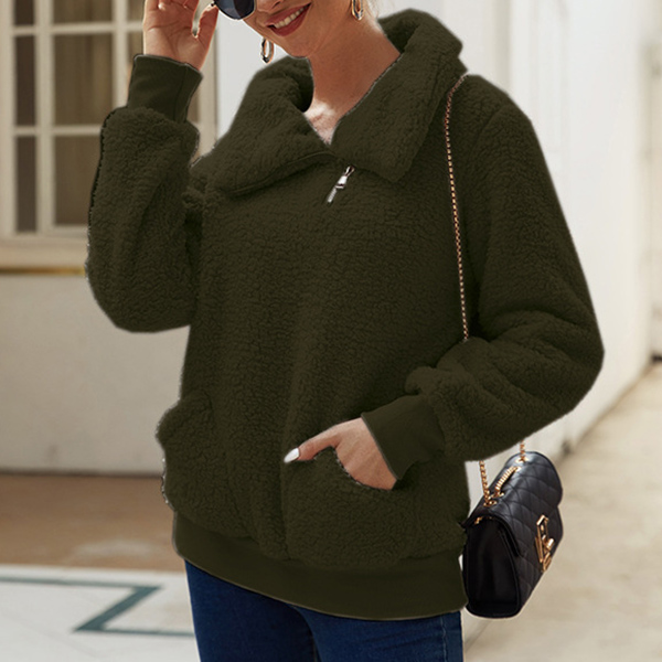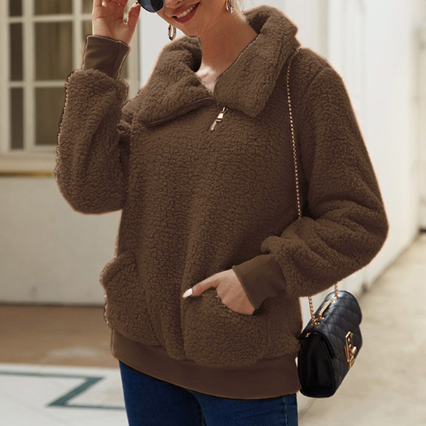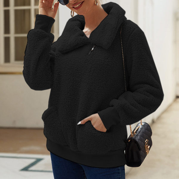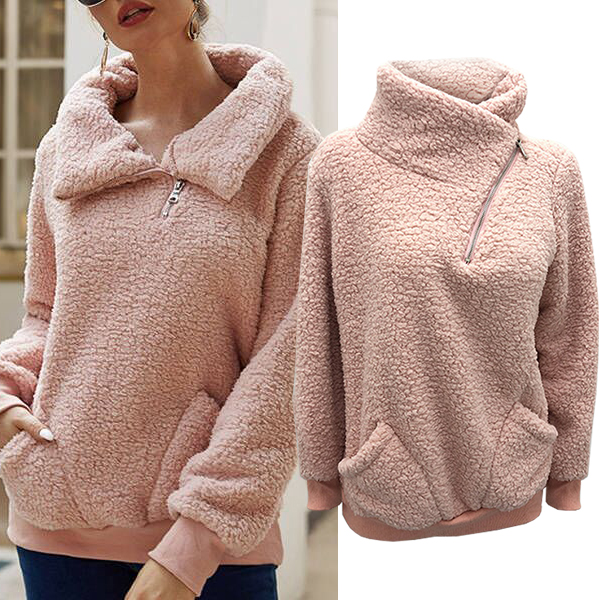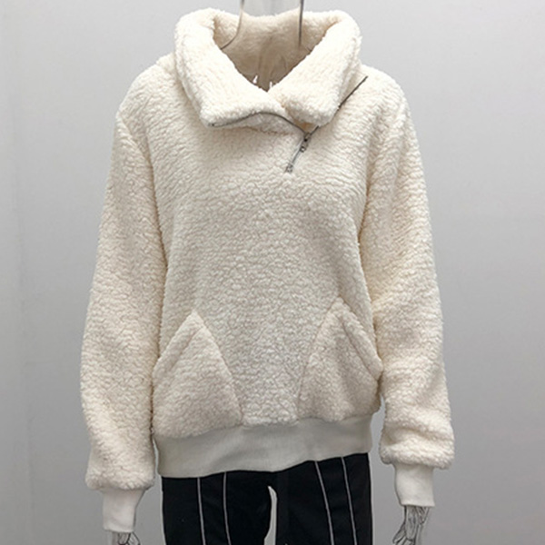 This sweatshirt offers both style and comfort, making it a must-have addition to your cozy collection. Featuring a slant zipper, it could be a stand collar or a mock neck design! Crafted from plush fabric, this sweatshirt ensures a soft and cozy feel against your skin.