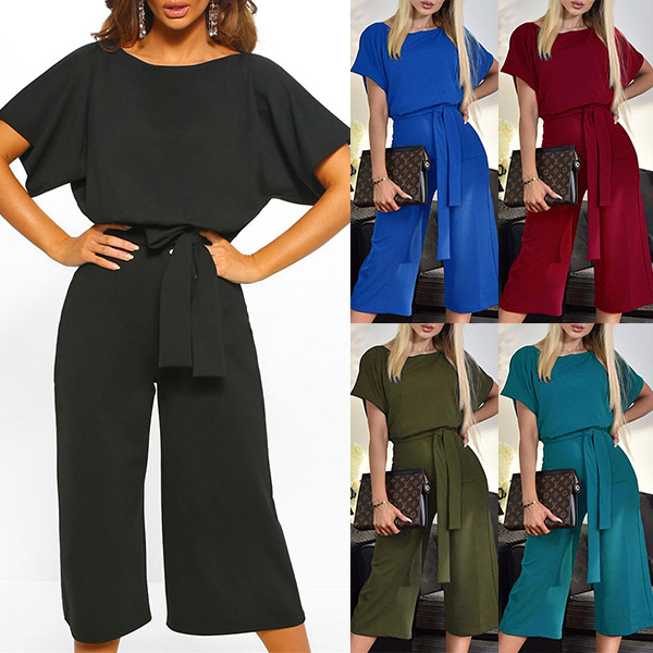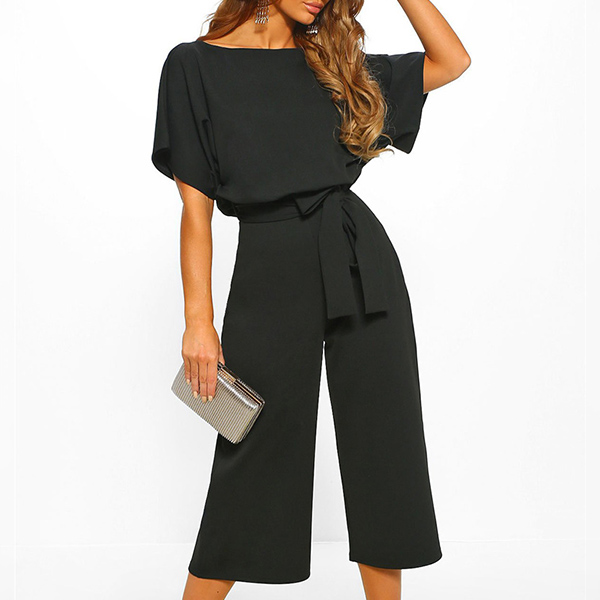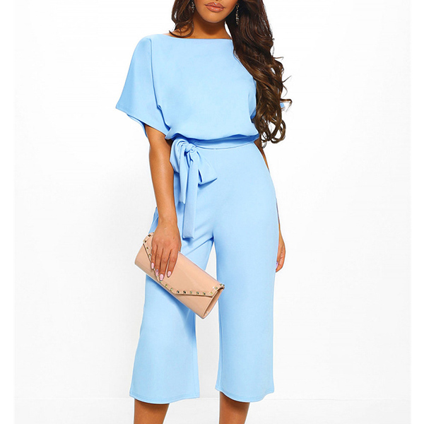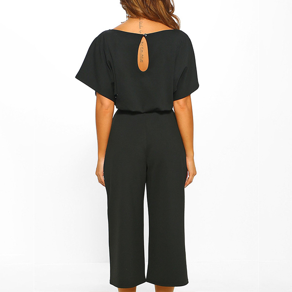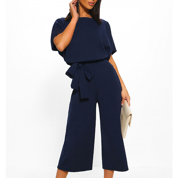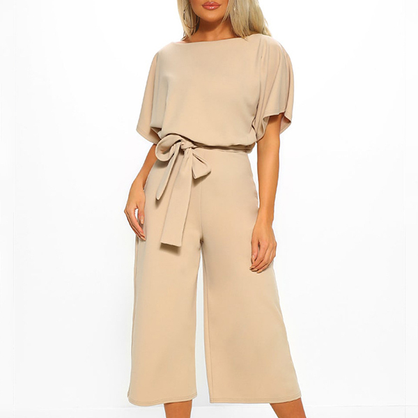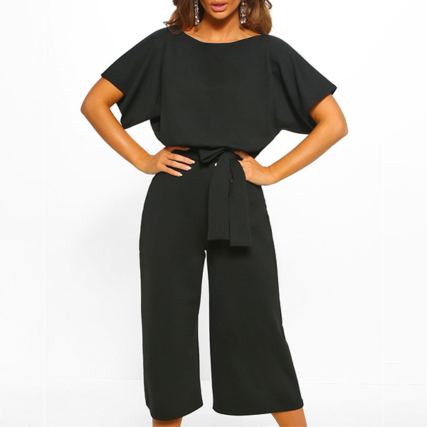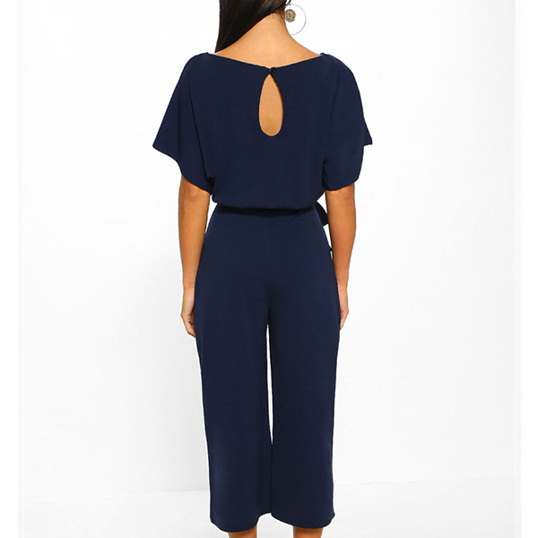 Casual Solid Color Batwing Sleeve Self-tie Gaucho Pants Jumpsuit
