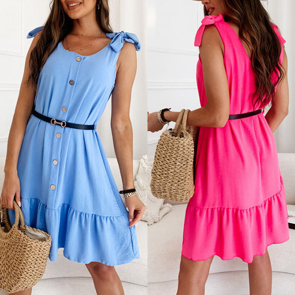Casual Solid Color Button Self-tie Round Neck Sleeveless Tiered Dress