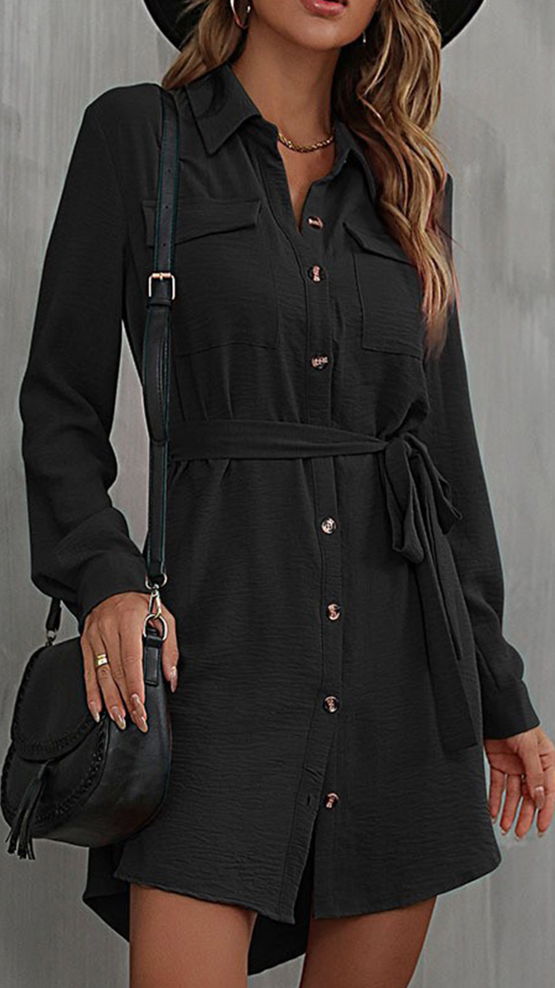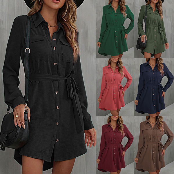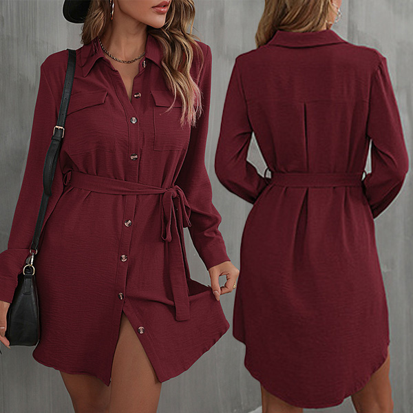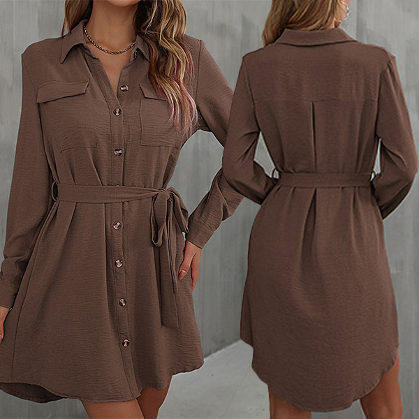 This shirt dress features a button-front closure and a stand collar, and long sleeve for a classic look! This dress is designed to be comfortable and can be worn in casual settings, offering a stylish and effortless look.