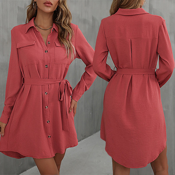 Casual Solid Color Button Stand Collar Long Sleeve Self-tie Shirt Dress