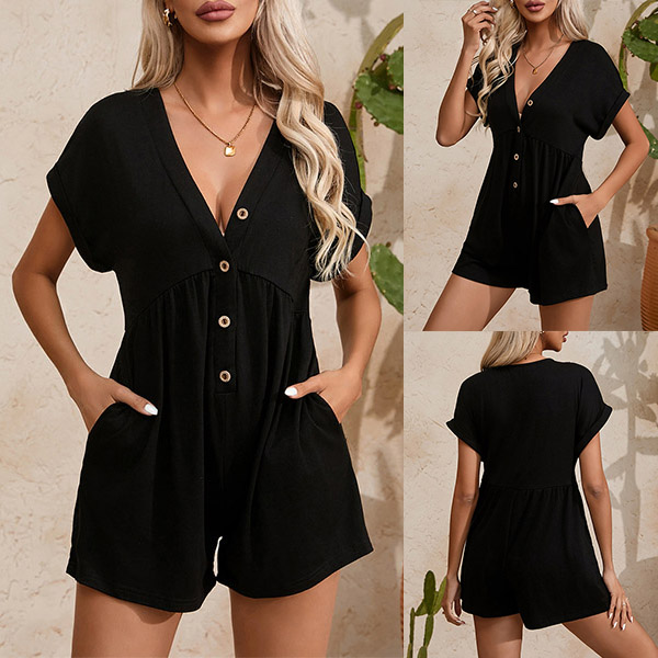 Casual Solid Color Button V-neck Short Sleeve Romper