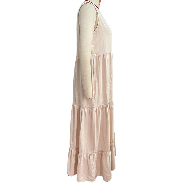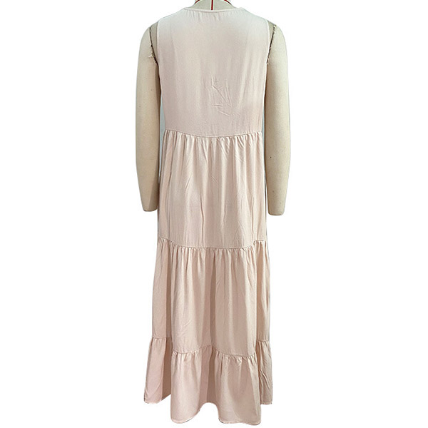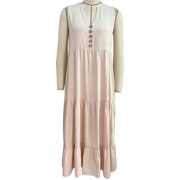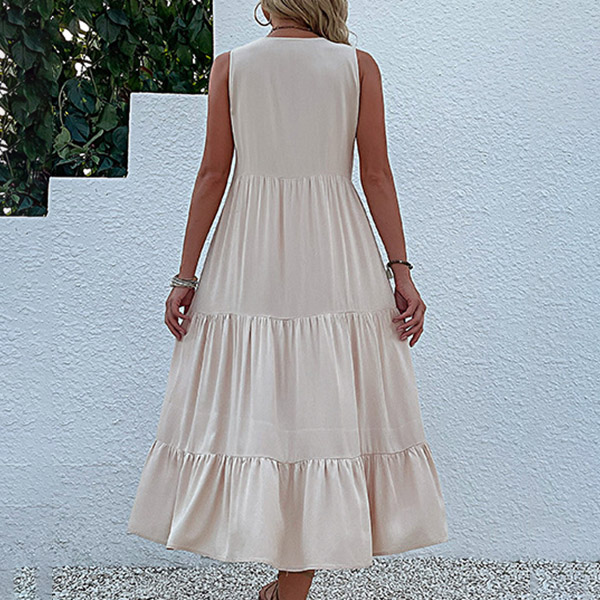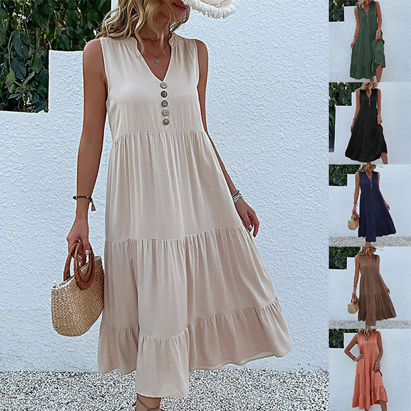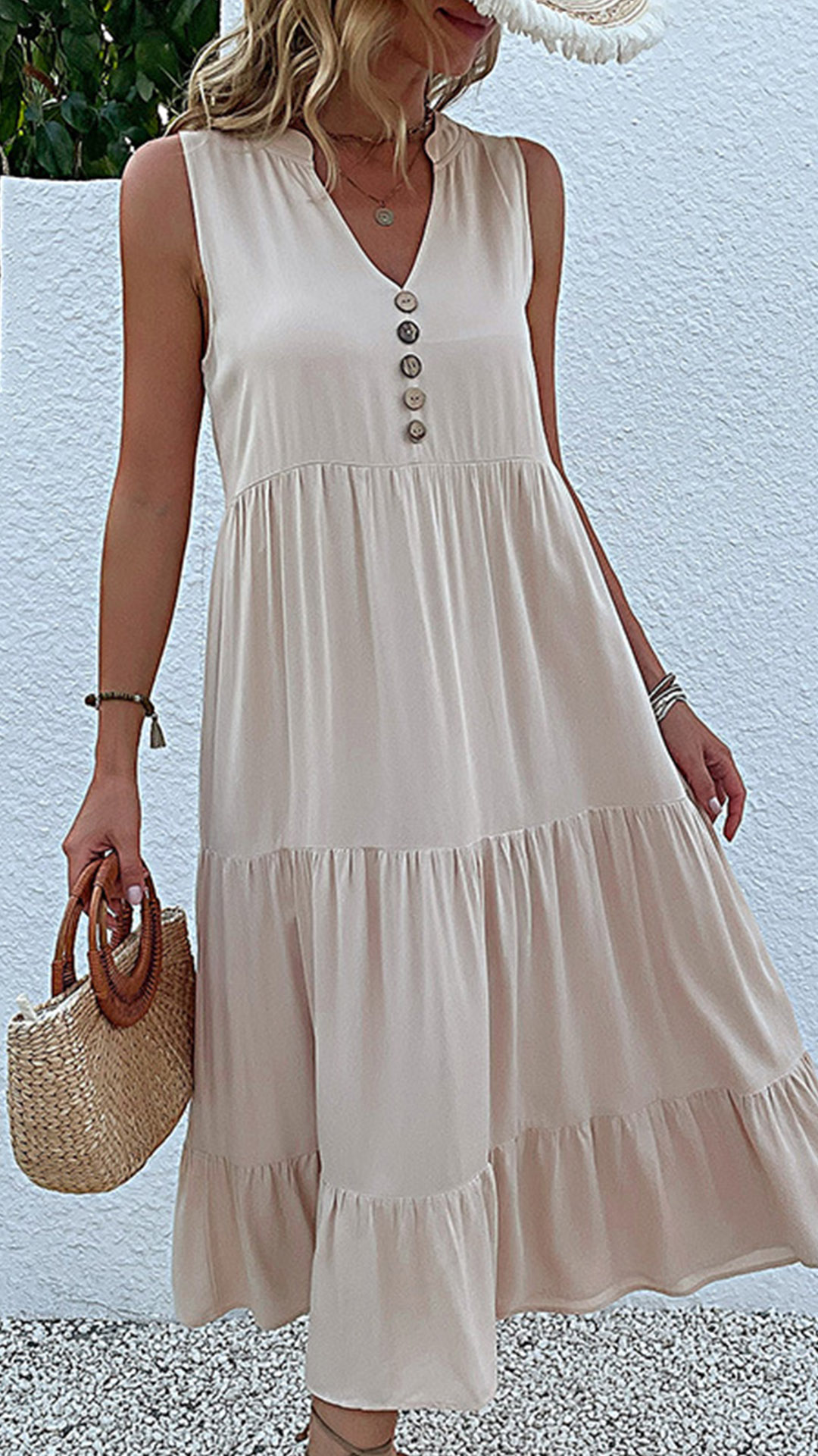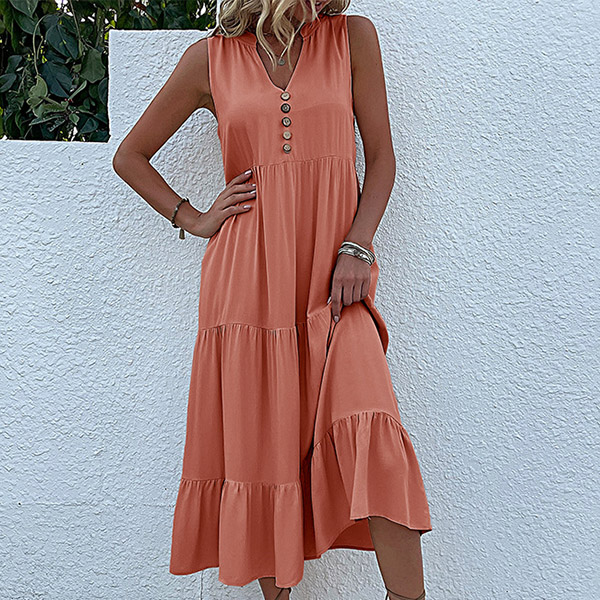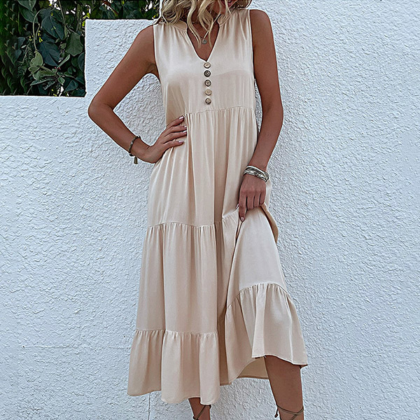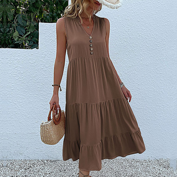 Casual Solid Color Button V-neck Sleeveless Tiered Dress