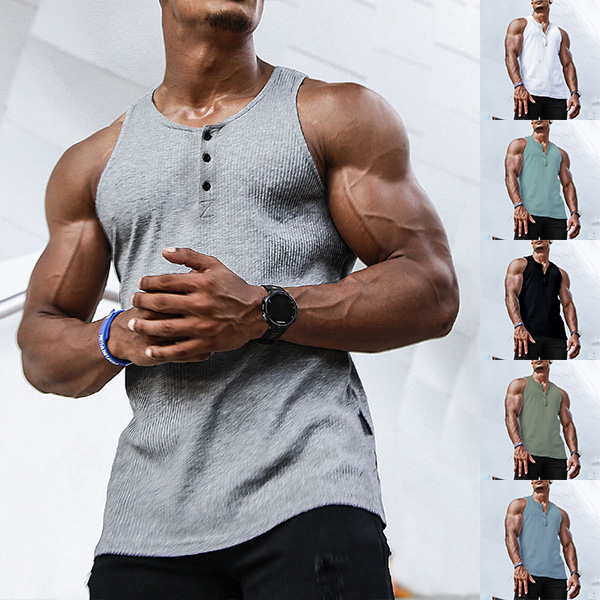 Casual Solid Color Buttoned Round Neck Sleeveless Shirt for Men