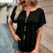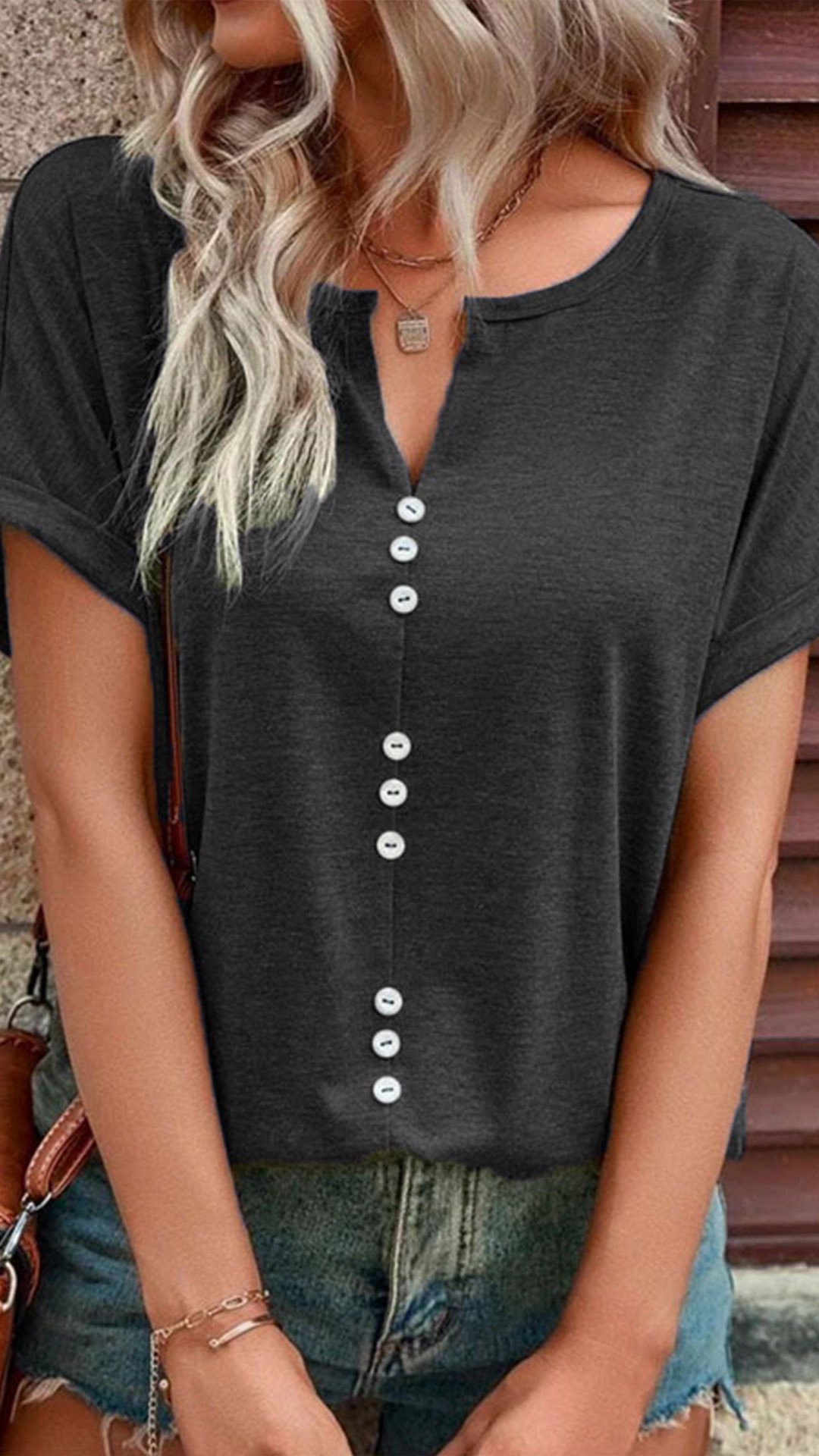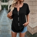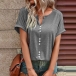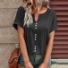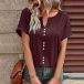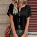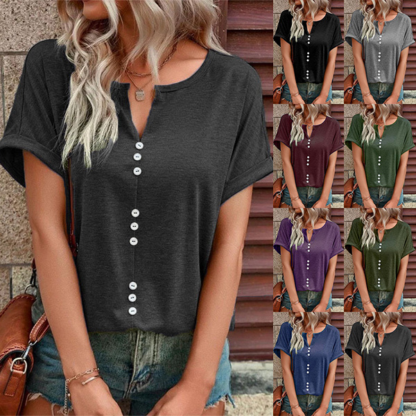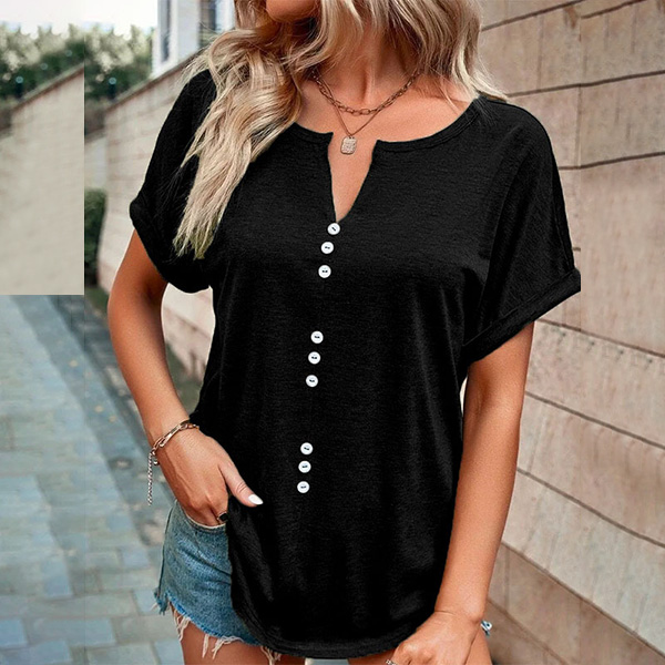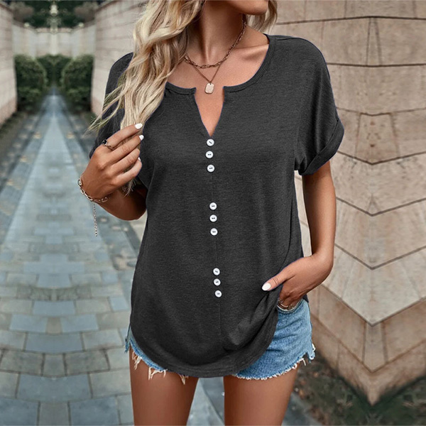 This casual shirt features a stylish slit V-neck design and short sleeves, making it perfect for warm weather. I like the front buttoend design, and you?