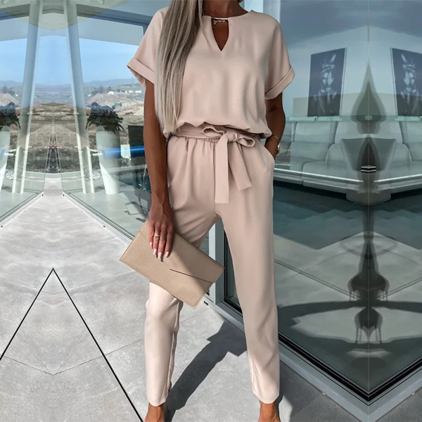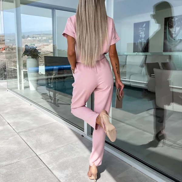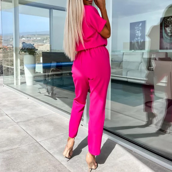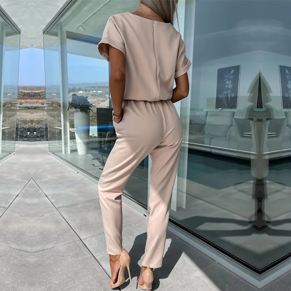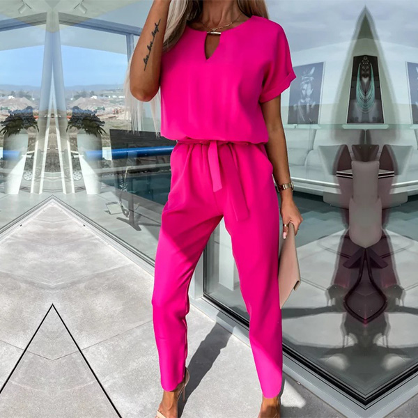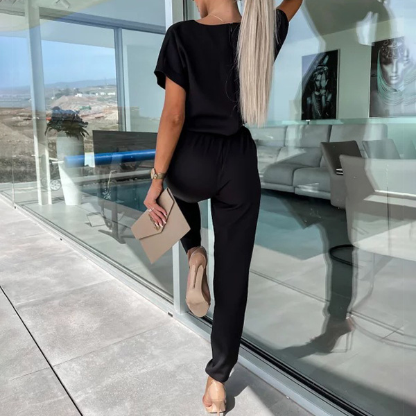 Casual Solid Color Cutout Short Sleeve Self-tie Jumpsuit