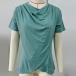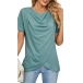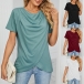 This shirt features a unique draped neckline that adds a touch of elegance to the casual design. The short sleeves and front slit create a relaxed and comfortable fit, making it perfect for everyday wear.