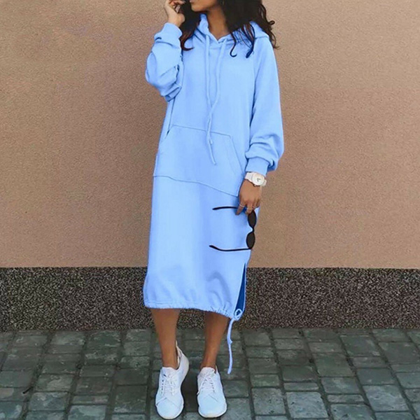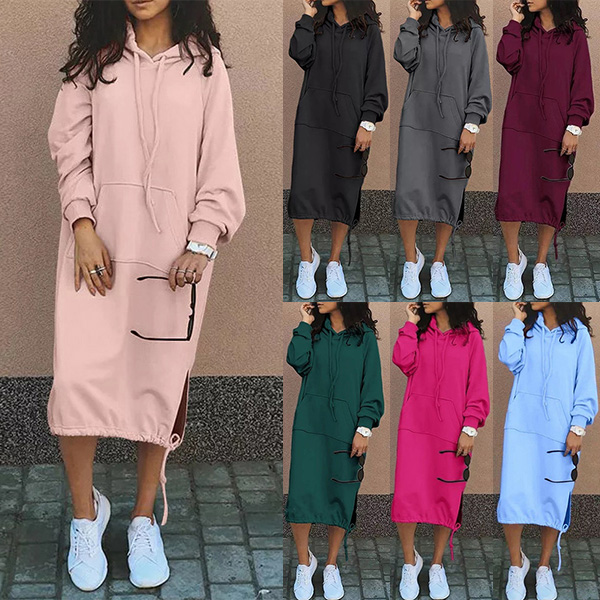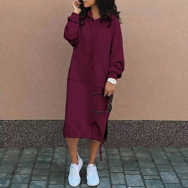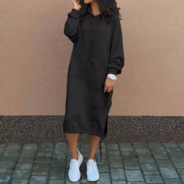 Casual Solid Color Drawstring Hooded Long Sleeve Kangaroo Pockets Side Slit Sweatshirt Dress