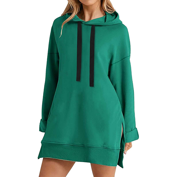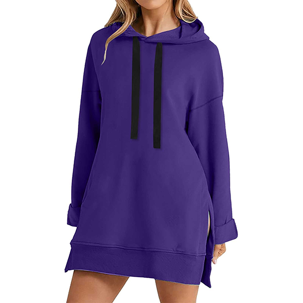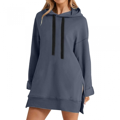 Casual Solid Color Drawstring Hooded Long Sleeve Side Slit Sweatshirt