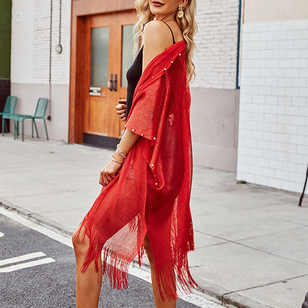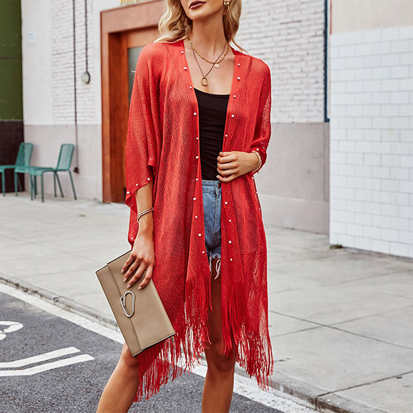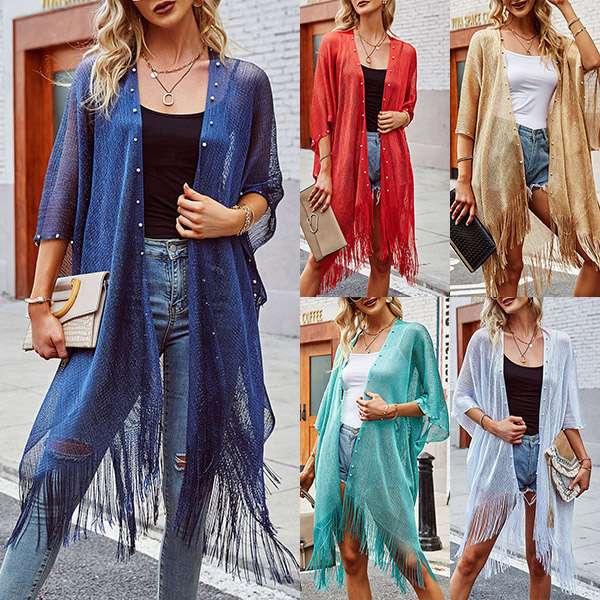 This cardigan features a beautiful beaded and tassel hemline, elbow sleeves, and a semi-through thin silhouette that makes it perfect for layering over your favorite outfits.