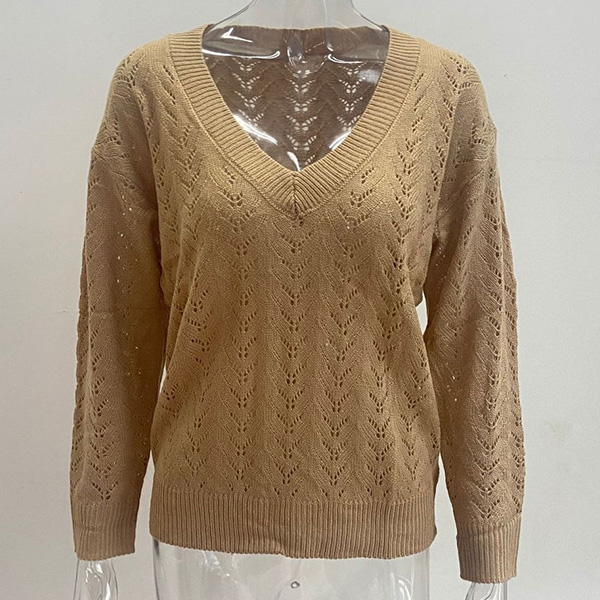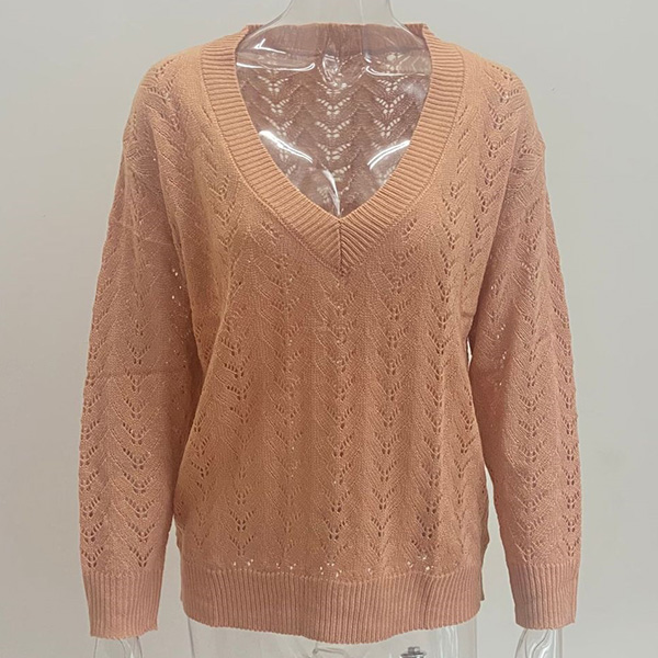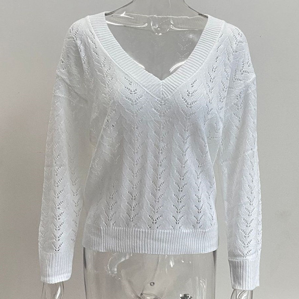 Casual Solid Color Floral Hollow-out V-neck Long Sleeve Knitted Shirt