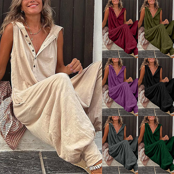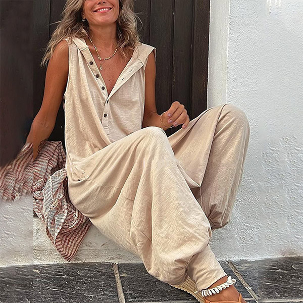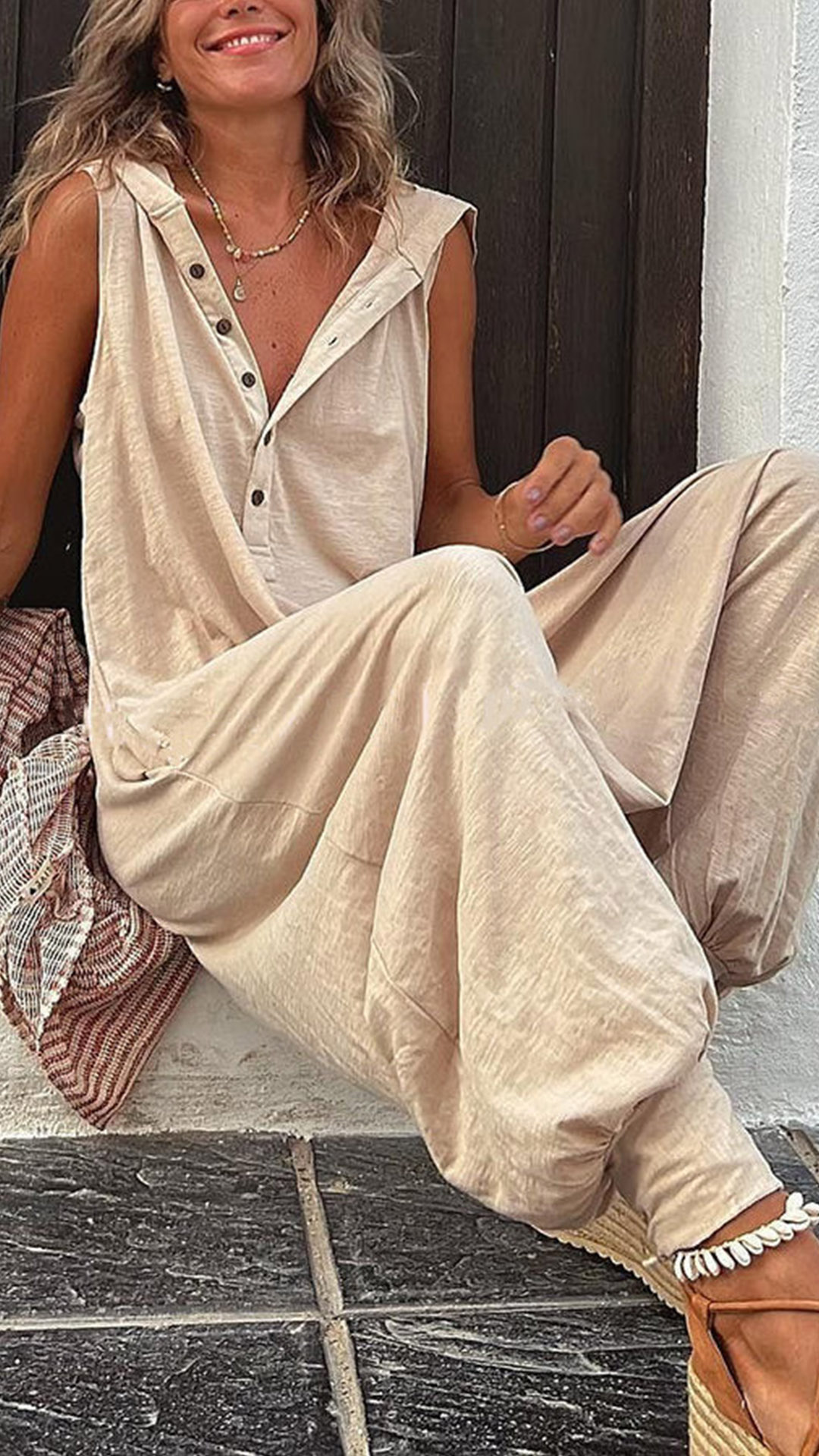 Casual Solid Color Front Button Sleeveless Hooded Jumpsuit
