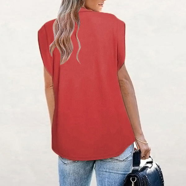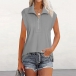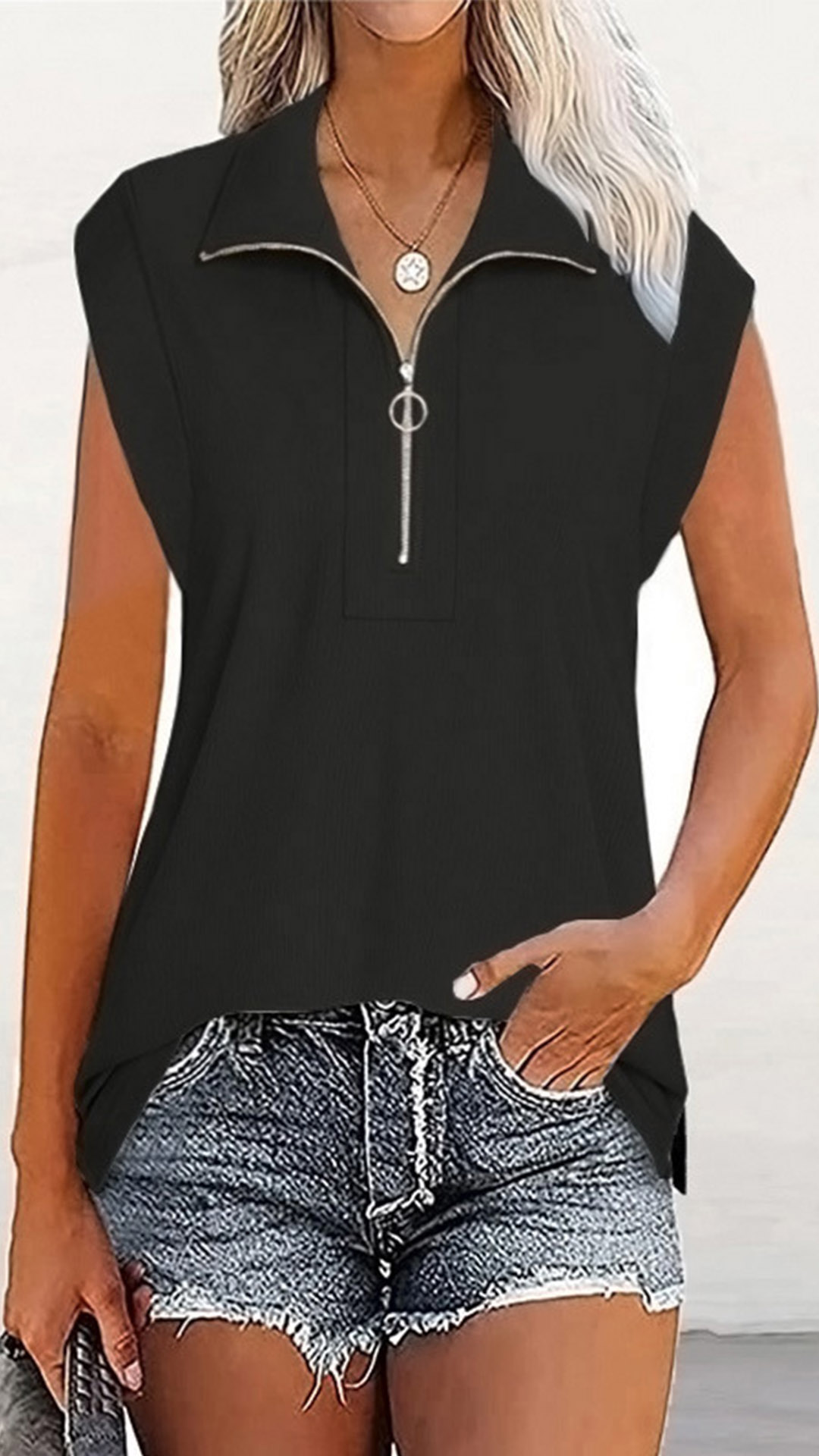 This sleeveless shirt features a half-zip stand collar and loose silhouette. It's perfect for pairing with jeans, shorts, or any casual pants to create a relaxed and chic look.