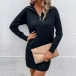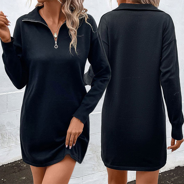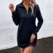 Casual Solid Color Half Zipper V-neck Long Sleeve Dress