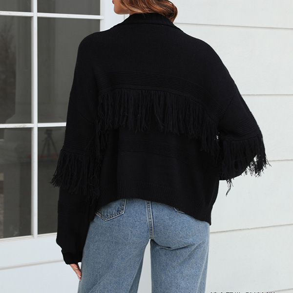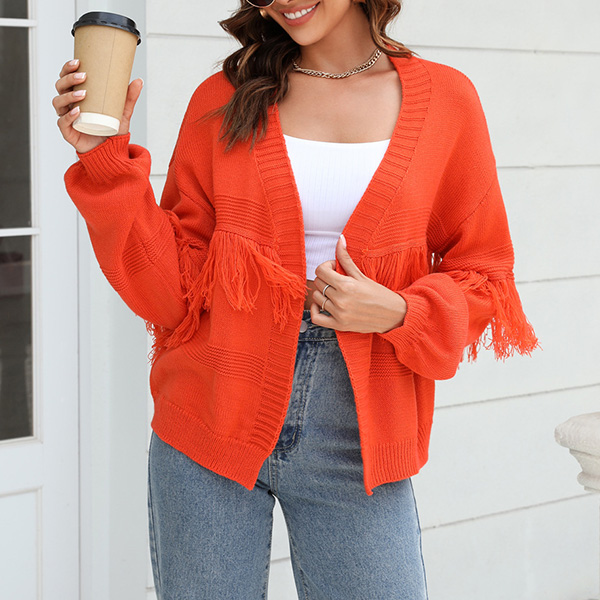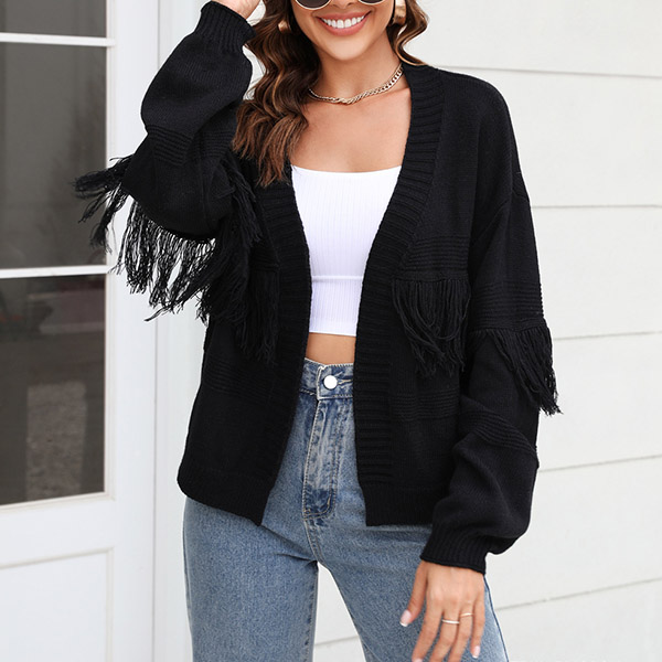 Made from knitted fabric, it offers a cozy and soft feel, perfect for chilly days. The tassel details add a playful and bohemian touch, giving the cardigan a unique and fashionable appeal. Wanna have a try?