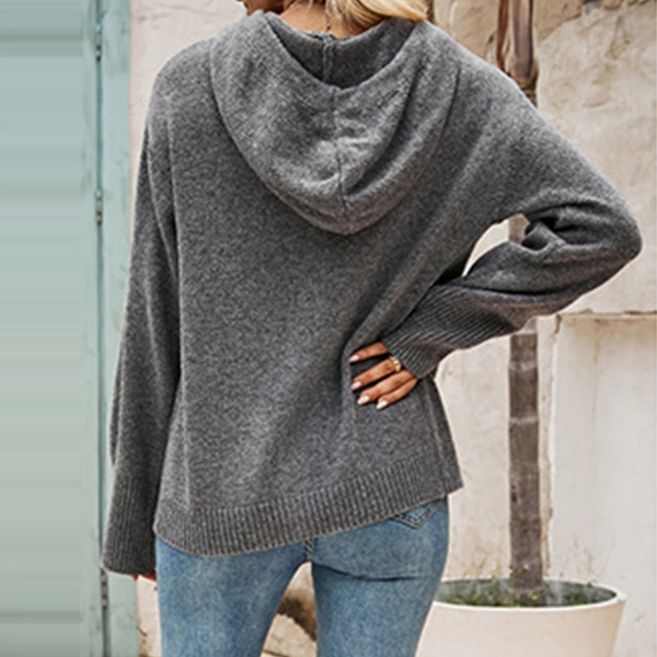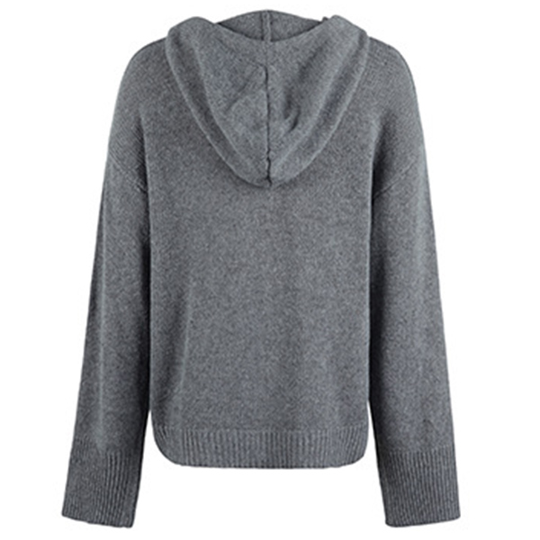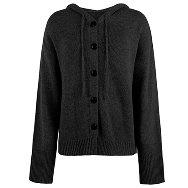 This hoodie cardigan features a solid color design and is made from a knitted fabric, providing warmth and comfort. The cardigan is buttoned in the front, allowing for easy wear and layering. It is a cozy and versatile piece for a casual and laid-back look.