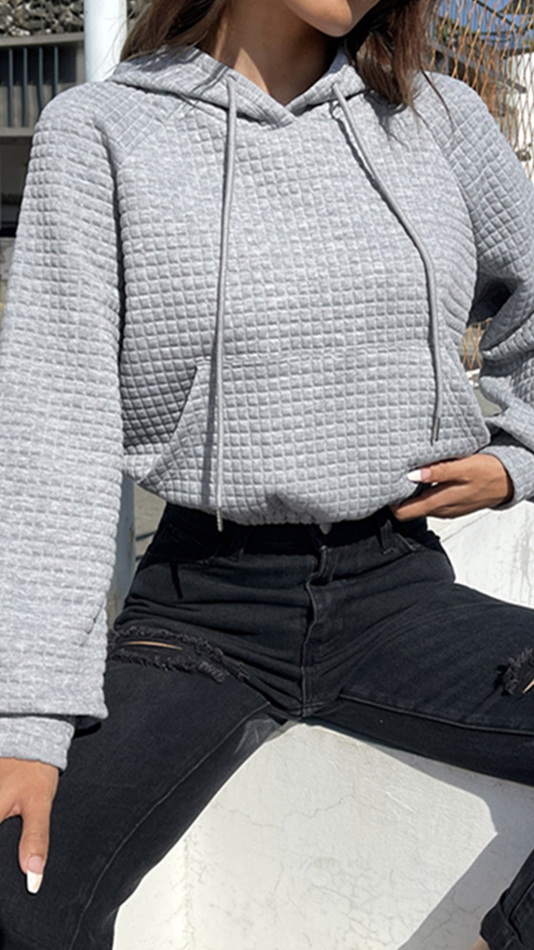 Casual Solid Color Long Sleeve Drawstring Hooded Waffle Texture Crop Sweatshirt