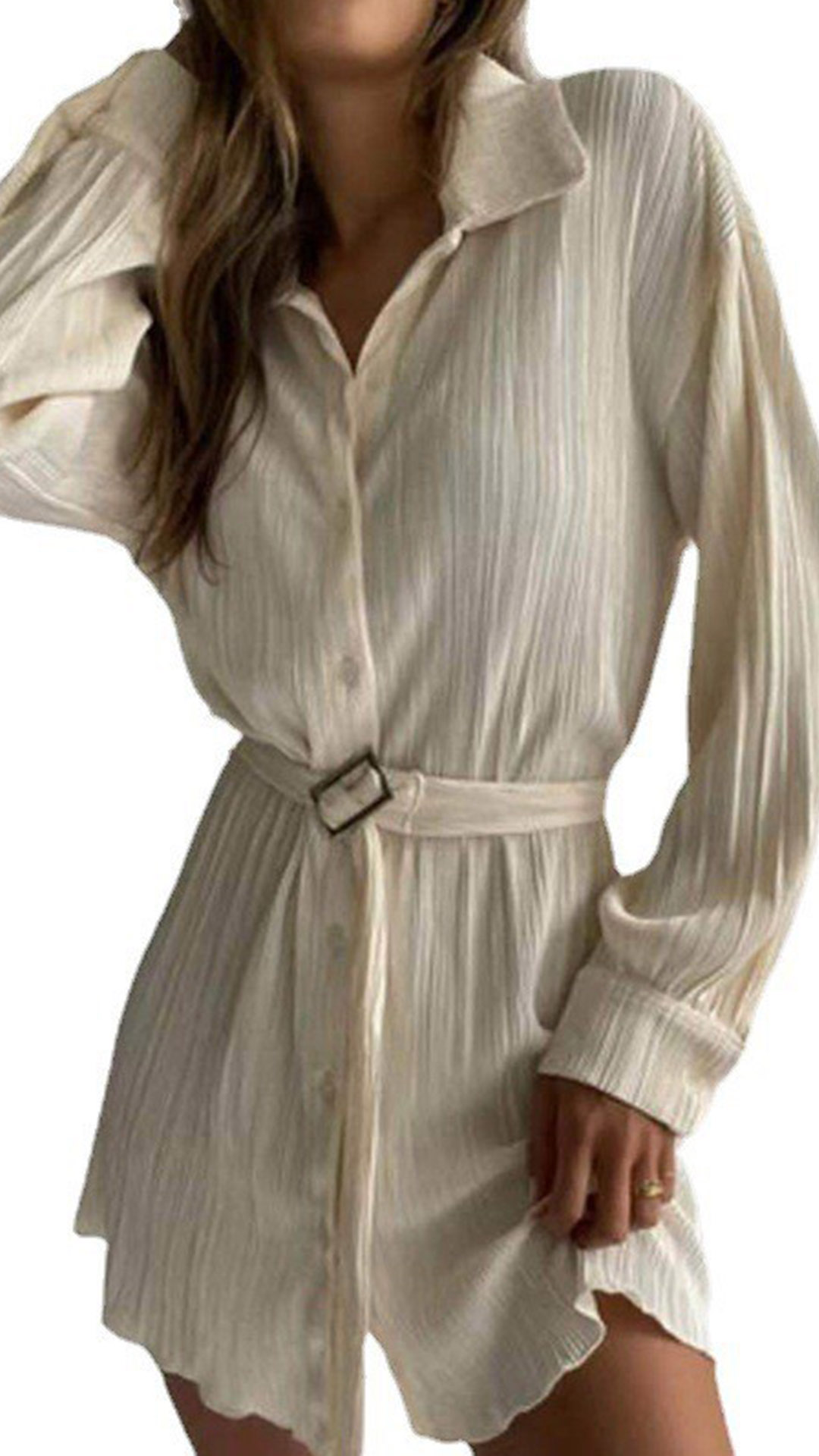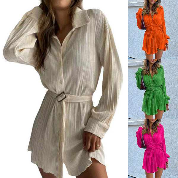 Casual Solid Color Long Sleeve Polo Neck Buttoned Blouse Dress with Belt