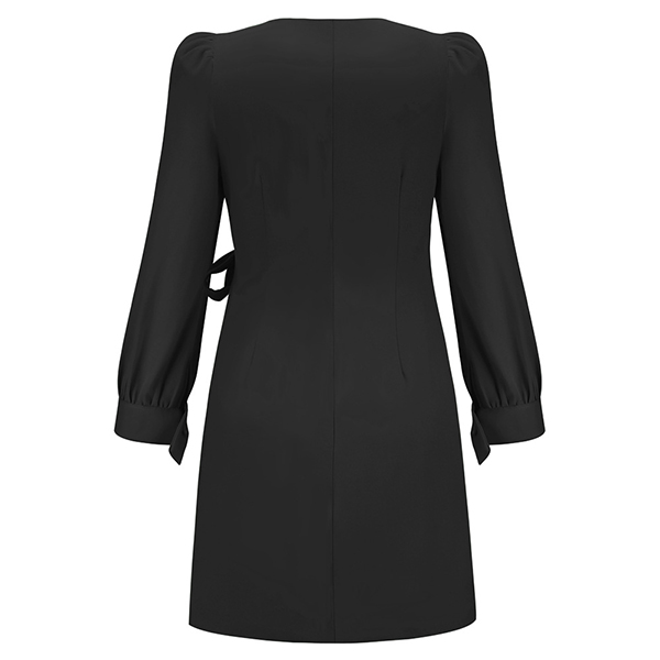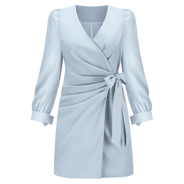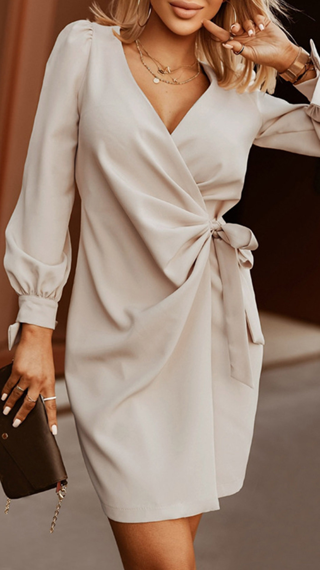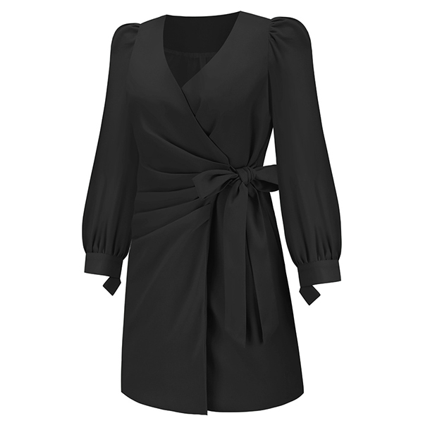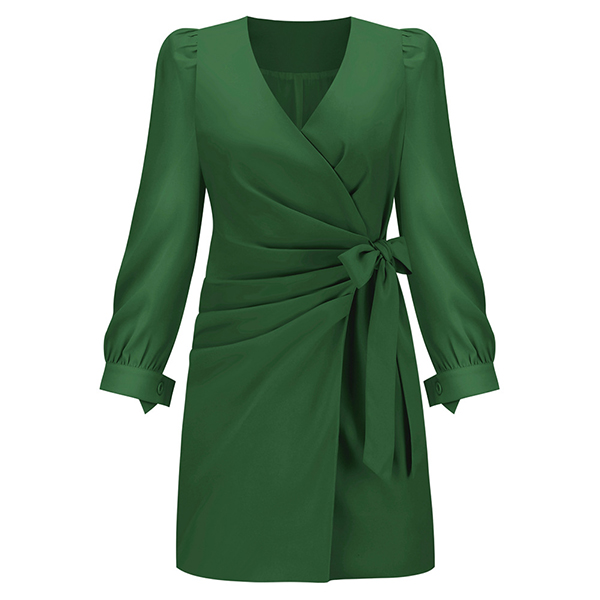 This dress is perfect for a casual day out! It features a solid color, long sleeves, a v-neck, and a self-tie wrap. The wrap design is both flattering and comfortable, and the solid color makes it easy to style with your favorite accessories.