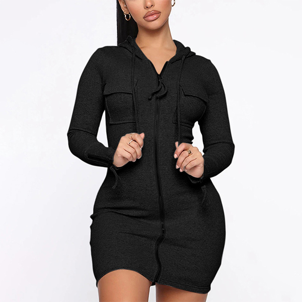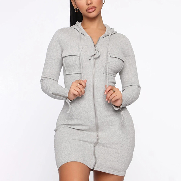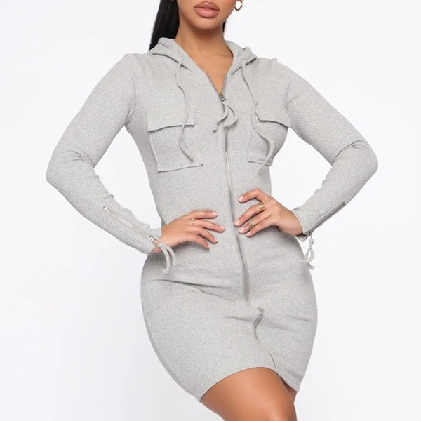 Casual Solid Color Long Sleeve Zipper Hooded Bodycon Dress